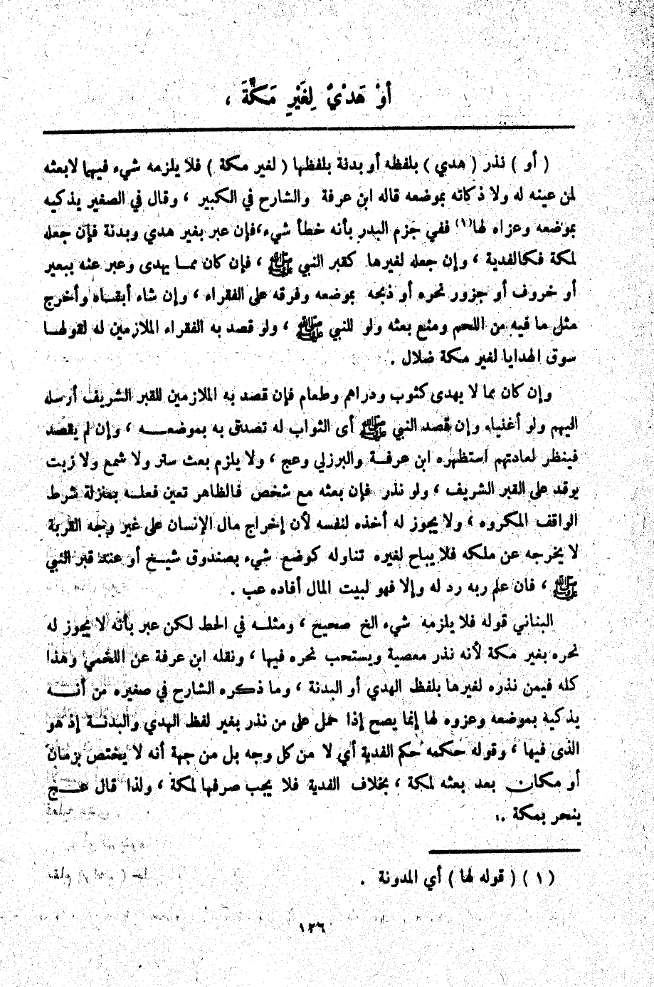 ـــــــــــــــــــــــــــــQأَوْ) نَذَرَ (هَدْيٍ) بِلَفْظِهِ أَوْ بَدَنَةٍ بِلَفْظِهَا (لِغَيْرِ مَكَّةَ) فَلَا يَلْزَمُهُ شَيْءٌ فِيهِمَا لَا بَعْثُهُ لِمَنْ عَيَّنَهُ لَهُ، وَلَا ذَكَاتُهُ بِمَوْضِعِهِ قَالَهُ ابْنُ عَرَفَةَ وَالشَّارِحُ فِي الْكَبِيرِ، وَقَالَ فِي الصَّغِيرِ يُذَكِّيهِ بِمَوْضِعِهِ وَعَزَاهُ لَهَا فَفِي جَزْمِ الْبَدْرِ بِأَنَّهُ خَطَأٌ شَيْءٌ، فَإِنْ عَبَّرَ بِغَيْرِ هَدْيٍ وَبَدَنَةٍ فَإِنْ جَعَلَهُ لِمَكَّةَ فَكَالْفِدْيَةِ، وَإِنْ جَعَلَهُ لِغَيْرِهَا كَقَبْرِ النَّبِيِّ - صَلَّى اللَّهُ عَلَيْهِ وَسَلَّمَ - فَإِنْ كَانَ مِمَّا يُهْدَى وَعَبَّرَ عَنْهُ بِبَعِيرٍ أَوْ خَرُوفٍ أَوْ جَزُورٍ نَحَرَهُ أَوْ ذَبَحَهُ بِمَوْضِعِهِ وَفَرَّقَهُ عَلَى الْفُقَرَاءِ، وَإِنْ شَاءَ أَبْقَاهُ وَأَخْرَجَ مِثْلَ مَا فِيهِ مِنْ اللَّحْمِ وَمَنَعَ بَعْثَهُ وَلَوْ لِلنَّبِيِّ - صَلَّى اللَّهُ عَلَيْهِ وَسَلَّمَ - وَلَوْ قَصَدَ بِهِ الْفُقَرَاءَ الْمُلَازِمِينَ لَهُ لِقَوْلِهَا سَوْقُ الْهَدَايَا لِغَيْرِ مَكَّةَ ضَلَالٌ. وَإِنْ كَانَ مِمَّا لَا يُهْدَى كَثَوْبٍ وَدَرَاهِمَ وَطَعَامٍ فَإِنْ قَصَدَ بِهِ الْمُلَازِمِينَ لِلْقَبْرِ الشَّرِيفِ أَرْسَلَهُ إلَيْهِمْ وَلَوْ أَغْنِيَاءَ وَإِنْ قَصَدَ النَّبِيَّ - صَلَّى اللَّهُ عَلَيْهِ وَسَلَّمَ - أَيْ الثَّوَابَ لَهُ تَصَدَّقَ بِهِ بِمَوْضِعِهِ، وَإِنْ لَمْ يَقْصِدْ فَيُنْظَرُ لِعَادَتِهِمْ اسْتَظْهَرَهُ ابْنُ عَرَفَةَ وَالْبَرْزَلِيُّ وعج، وَلَا يَلْزَمُ بَعْثُ سُتُرٍ، وَلَا شَمْعٍ، وَلَا زَيْتٍ يُوقَدُ عَلَى الْقَبْرِ الشَّرِيفِ، وَلَوْ نَذَرَ فَإِنْ بَعَثَهُ مَعَ شَخْصٍ فَالظَّاهِرُ تَعَيُّنُ فِعْلِهِ بِمَنْزِلَةِ شَرْطِ الْوَاقِفِ الْمَكْرُوهِ، وَلَا يَجُوزُ لَهُ أَخْذُهُ لِنَفْسِهِ؛ لِأَنَّ إخْرَاجَ مَالِ الْإِنْسَانِ عَلَى غَيْرِ وَجْهِ الْقُرْبَةِ لَا يُخْرِجُهُ عَنْ مِلْكِهِ فَلَا يُبَاحُ لِغَيْرِهِ تَنَاوُلُهُ كَوَضْعِ شَيْءٍ بِصُنْدُوقِ شَيْخٍ أَوْ عِنْدَ قَبْرِ النَّبِيِّ - صَلَّى اللَّهُ عَلَيْهِ وَسَلَّمَ - فَإِنْ عُلِمَ رَبُّهُ رُدَّ لَهُ وَإِلَّا فَهُوَ لِبَيْتِ الْمَالِ أَفَادَهُ عب.