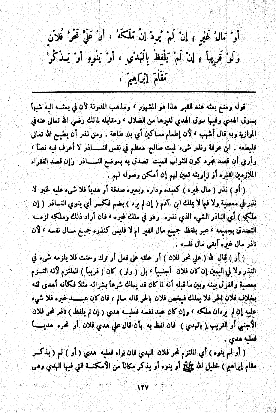 أَوْ مَالُ غَيْرٍ؛ إنْ لَمْ يُرِدْ إنْ مَلَكَهُ، أَوْ عَلَى نَحْرِ فُلَانٍ وَلَوْ قَرِيبًا؛ إنْ لَمْ يَلْفِظْ بِالْهَدْيِ، أَوْ يَنْوِهِ أَوْ يَذْكُرْ مَقَامَ إبْرَاهِيمَ