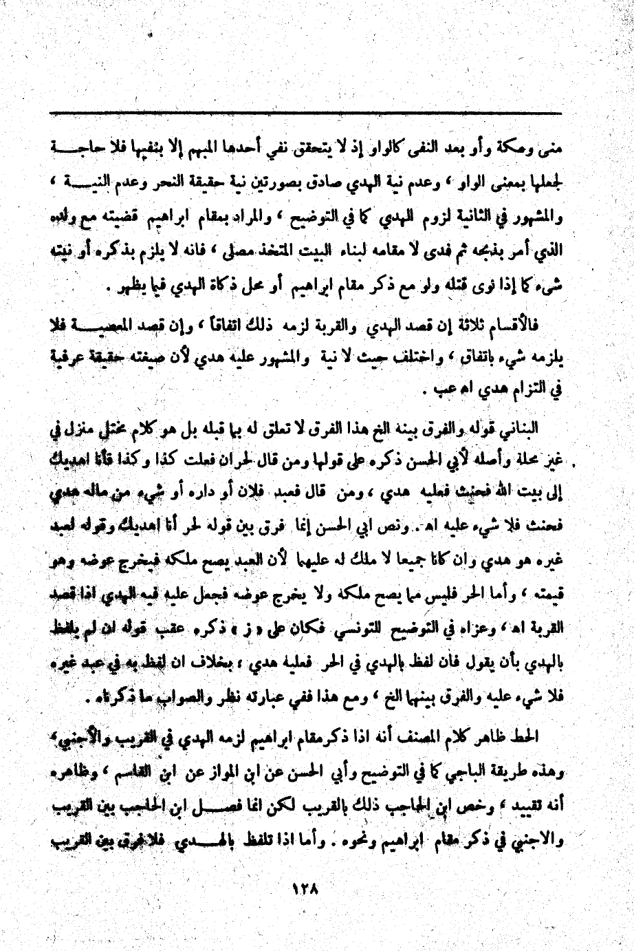 ـــــــــــــــــــــــــــــQمِنًى وَمَكَّةَ وَأَوْ بَعْدَ النَّفْيِ كَالْوَاوِ إذْ لَا يَتَحَقَّقُ نَفْيُ أَحَدِهَا الْمُبْهَمِ إلَّا بِنَفْيِهَا فَلَا حَاجَةَ لِجَعْلِهَا بِمَعْنَى الْوَاوِ، وَعَدَمُ نِيَّةِ الْهَدْيِ صَادِقٌ بِصُورَتَيْنِ نِيَّةُ حَقِيقَةِ النَّحْرِ وَعَدَمُ النِّيَّةِ وَالْمَشْهُورُ فِي الثَّانِيَةِ لُزُومُ الْهَدْيِ كَمَا فِي التَّوْضِيحِ، وَالْمُرَادُ بِمَقَامِ إبْرَاهِيمَ قَضِيَّتُهُ مَعَ وَلَدِهِ الَّذِي أُمِرَ بِذَبْحِهِ ثُمَّ فُدِيَ لَا مَقَامُهُ لِبِنَاءِ الْبَيْتِ الْمُتَّخَذِ مُصَلًّى، فَإِنَّهُ لَا يَلْزَمُ بِذِكْرِهِ أَوْ نِيَّتِهِ شَيْءٌ كَمَا إذَا نَوَى قَتْلَهُ وَلَوْ مَعَ ذِكْرِ مَقَامِ إبْرَاهِيمَ أَوْ مَحَلِّ ذَكَاةِ الْهَدْيِ فِيمَا يَظْهَرُ. فَالْأَقْسَامُ ثَلَاثَةٌ إنْ قَصَدَ الْهَدْيَ وَالْقُرْبَةَ لَزِمَهُ ذَلِكَ اتِّفَاقًا، وَإِنْ قَصَدَ الْمَعْصِيَةَ فَلَا يَلْزَمُهُ شَيْءٌ بِاتِّفَاقٍ، وَاخْتُلِفَ حَيْثُ لَا نِيَّةَ وَالْمَشْهُورُ عَلَيْهِ هَدْيٌ؛ لِأَنَّ صِيغَتَهُ حَقِيقِيَّةٌ عُرْفِيَّةٌ فِي الْتِزَامِ هَدْيٍ. اهـ عب. الْبُنَانِيُّ قَوْلُهُ وَالْفَرْقُ بَيْنَهُ إلَخْ هَذَا الْفَرْقُ لَا تَعَلُّقَ لَهُ بِمَا قَبْلَهُ بَلْ هُوَ كَلَامٌ مُخْتَلٌّ مُنْزَلٌ فِي غَيْرِ مَحَلِّهِ وَأَصْلُهُ لِأَبِي الْحَسَنِ ذَكَرَهُ عَلَى قَوْلِهَا وَمَنْ قَالَ لِحُرٍّ إنْ فَعَلْت كَذَا وَكَذَا فَأَنَا أُهْدِيك إلَى بَيْتِ اللَّهِ فَحَنِثَ فَعَلَيْهِ هَدْيٌ، وَمَنْ قَالَ فَعَبْدُ فُلَانٍ أَوْ دَارُهُ أَوْ شَيْءٌ مِنْ مَالِهِ هَدْيٌ فَحَنِثَ فَلَا شَيْءَ عَلَيْهِ. اهـ.
