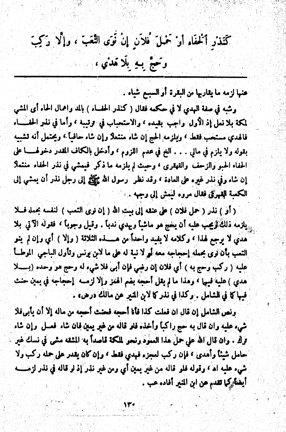 وَشَبَّهَ فِي صِفَةِ الْهَدْيِ لَا فِي حُكْمِهِ فَقَالَ (كَنَذْرِ الْحَفَاءِ) بِالْمَدِّ وَإِهْمَالِ الْحَاءِ أَيْ الْمَشْيِ لِمَكَّةَ بِلَا نَعْلٍ إذْ الْأَوَّلُ وَاجِبٌ بِقَيْدِهِ، وَالِاسْتِحْبَابُ فِي تَرْتِيبِهِ، وَأَمَّا فِي نَذْرِ الْحَفَاءِ فَالْهَدْيُ مُسْتَحَبٌّ فَقَطْ، وَيَلْزَمُهُ الْحَجُّ إنْ شَاءَ مُنْتَعِلًا وَإِنْ شَاءَ حَافِيًا، وَيُحْتَمَلُ أَنَّهُ تَشْبِيهٌ بِقَوْلِهِ، وَلَا يَلْزَمُ فِي مَالِي. . . إلَخْ فِي عَدَمِ اللُّزُومِ، وَأَدْخَلَ بِالْكَافِ الْمُقَدَّرِ دُخُولَهَا عَلَى الْحَفَاءِ الْحَبْوَ وَالزَّحْفَ وَالْقَهْقَرَى، وَحَيْثُ لَمْ يَلْزَمْهُ مَا ذَكَرَ فَيَمْشِي فِي نَذْرِ الْحَفَاءِ مُنْتَعِلًا إنْ شَاءَ وَفِي نَذْرِ غَيْرِهِ عَلَى الْعَادَةِ، وَقَدْ «نَظَرَ رَسُولُ اللَّهِ - صَلَّى اللَّهُ عَلَيْهِ وَسَلَّمَ - إلَى رَجُلٍ نَذَرَ أَنْ يَمْشِيَ إلَى الْكَعْبَةِ الْقَهْقَرَى فَقَالَ مُرُوهُ لِيَمْشِ إلَى وَجْهِهِ» .