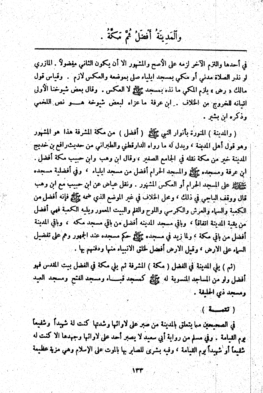 (وَالْمَدِينَةُ) الْمُنَوَّرَةُ بِأَنْوَارِ النَّبِيِّ - صَلَّى اللَّهُ عَلَيْهِ وَسَلَّمَ - (أَفْضَلُ) مِنْ مَكَّةَ الْمُشَرَّفَةِ هَذَا هُوَ الْمَشْهُورُ وَهُوَ قَوْلُ أَهْلِ الْمَدِينَةِ، وَيَدُلُّ لَهُ مَا رَوَاهُ الدَّارَقُطْنِيُّ وَالطَّبَرَانِيُّ مِنْ حَدِيثِ رَافِعِ بْنِ خَدِيجٍ «الْمَدِينَةُ خَيْرٌ مِنْ مَكَّةَ» نَقَلَهُ فِي الْجَامِعِ الصَّغِيرِ، وَقَالَ ابْنُ وَهْبٍ وَابْنُ حَبِيبٍ مَكَّةُ أَفْضَلُ. ابْنُ عَرَفَةَ وَمَسْجِدُهُ - صَلَّى اللَّهُ عَلَيْهِ وَسَلَّمَ - وَالْمَسْجِدُ الْحَرَامُ أَفْضَلُ مِنْ مَسْجِدِ إيلْيَاءَ، وَفِي أَفْضَلِيَّةِ مَسْجِدِهِ - صَلَّى اللَّهُ عَلَيْهِ وَسَلَّمَ - عَلَى الْمَسْجِدِ الْحَرَامِ أَوْ الْعَكْسُ الْمَشْهُورُ. وَنَقَلَ عِيَاضٌ عَنْ ابْنِ حَبِيبٍ مَعَ ابْنِ وَهْبٍ قَالَ وَوَقَفَ الْبَاجِيَّ فِي ذَلِكَ، وَمَحَلُّ الْخِلَافِ فِي غَيْرِ الْمَوْضِعِ الَّذِي ضَمَّهُ - صَلَّى اللَّهُ عَلَيْهِ وَسَلَّمَ - فَإِنَّهُ أَفْضَلُ مِنْ الْكَعْبَةِ وَالسَّمَاءِ وَالْعَرْشِ وَالْكُرْسِيِّ وَاللَّوْحِ وَالْقَلَمِ وَالْبَيْتِ الْمَعْمُورِ وَيَلِيهِ الْكَعْبَةُ فَهِيَ أَفْضَلُ مِنْ بَقِيَّةِ الْمَدِينَةِ اتِّفَاقًا، وَبَاقِي مَسْجِدِ الْمَدِينَةِ أَفْضَلُ مِنْ بَاقِي مَسْجِدِ مَكَّةَ، وَبَاقِي الْمَدِينَةِ أَفْضَلُ مِنْ بَاقِي مَكَّةَ، وَلِمَا زِيدَ فِي مَسْجِدِهِ - صَلَّى اللَّهُ عَلَيْهِ وَسَلَّمَ - حُكْمُ مَسْجِدِهِ عِنْدَ الْجُمْهُورِ وَهُمْ عَلَى تَفْضِيلِ السَّمَاءِ عَلَى الْأَرْضِ، وَقِيلَ الْأَرْضُ أَفْضَلُ لِخَلْقِ الْأَنْبِيَاءِ مِنْهَا وَدَفْنِهِمْ بِهَا.