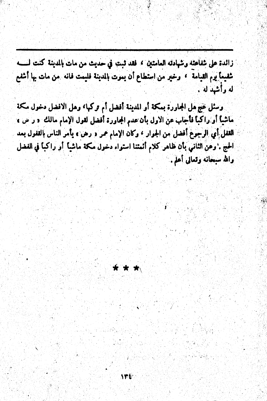 ـــــــــــــــــــــــــــــQزَائِدَةٌ عَلَى شَفَاعَتِهِ وَشَهَادَتِهِ الْعَامَّتَيْنِ، فَقَدْ ثَبَتَ فِي حَدِيثِ «مَنْ مَاتَ بِالْمَدِينَةِ كُنْت لَهُ شَفِيعًا يَوْمَ الْقِيَامَةِ، وَخَبَرُ مَنْ اسْتَطَاعَ أَنْ يَمُوتَ بِالْمَدِينَةِ فَلْيَمُتْ فَإِنَّهُ مَنْ مَاتَ بِهَا أَشْفَعُ لَهُ وَأَشْهَدُ لَهُ» . وَسُئِلَ عج هَلْ الْمُجَاوَرَةُ بِمَكَّةَ أَوْ الْمَدِينَةِ أَفْضَلُ أَمْ تَرْكُهَا، وَهَلْ الْأَفْضَلُ دُخُولُ مَكَّةَ مَاشِيًا أَوْ رَاكِبًا فَأَجَابَ عَنْ الْأَوَّلِ بِأَنَّ عَدَمَ الْمُجَاوَرَةِ أَفْضَلُ لِقَوْلِ الْإِمَامِ مَالِكٍ - رَضِيَ اللَّهُ عَنْهُ - لَقَفْلٌ أَيْ الرُّجُوعُ أَفْضَلُ مِنْ الْجِوَارِ، وَكَانَ الْإِمَامُ عُمَرُ - رَضِيَ اللَّهُ عَنْهُ - يَأْمُرُ النَّاسَ بِالْقُفُولِ بَعْدَ الْحَجِّ. وَعَنْ الثَّانِي بِأَنَّ ظَاهِرَ كَلَامِ أَئِمَّتِنَا اسْتِوَاءُ دُخُولِ مَكَّةَ مَاشِيًا أَوْ رَاكِبًا فِي الْفَضْلِ وَاَللَّهُ سُبْحَانَهُ وَتَعَالَى أَعْلَمُ.