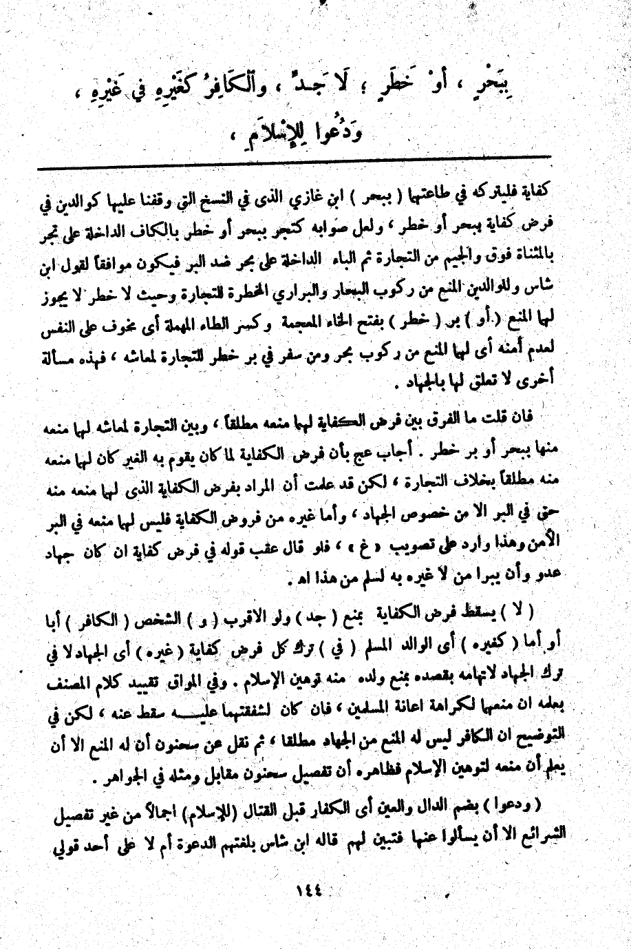 ـــــــــــــــــــــــــــــQكِفَايَةٍ فَلْيَتْرُكْهُ فِي طَاعَتِهِمَا (بِبَحْرٍ) ابْنُ غَازِيٍّ الَّذِي فِي النُّسَخِ الَّتِي وَقَفْنَا عَلَيْهَا كَوَالِدَيْنِ فِي فَرْضِ كِفَايَةٍ بِبَحْرٍ أَوْ خَطَرٍ، وَلَعَلَّ صَوَابَهُ كَتَجْرٍ بِبَحْرٍ أَوْ خَطَرٍ بِالْكَافِ الدَّاخِلَةِ عَلَى تَجْرٍ بِالْمُثَنَّاةِ فَوْقَ وَالْجِيمِ مِنْ التِّجَارَةِ ثُمَّ الْبَاءُ الدَّاخِلَةُ عَلَى بَحْرٍ ضِدِّ الْبَرِّ فَيَكُونُ مُوَافِقًا لِقَوْلِ ابْنِ شَاسٍ وَلِلْوَالِدَيْنِ الْمَنْعُ مِنْ رُكُوبِ الْبِحَارِ وَالْبَرَارِي الْمُخْطِرَةِ لِلتِّجَارَةِ وَحَيْثُ لَا خَطَرَ لَا يَجُوزُ لَهُمَا الْمَنْعُ (أَوْ) بَرٍّ (خَطِرٍ) بِفَتْحِ الْخَاءِ الْمُعْجَمَةِ وَكَسْرِ الطَّاءِ الْمُهْمَلَةِ أَيْ مَخُوفٍ عَلَى النَّفْسِ لِعَدَمِ أَمْنِهِ أَيْ لَهُمَا الْمَنْعُ مِنْ رُكُوبِ بَحْرٍ وَمِنْ سَفَرٍ فِي بَرٍّ خَطِرٍ لِلتِّجَارَةِ لِمَعَاشِهِ، فَهَذِهِ مَسْأَلَةٌ أُخْرَى لَا تَعَلُّقَ لَهَا بِالْجِهَادِ.
