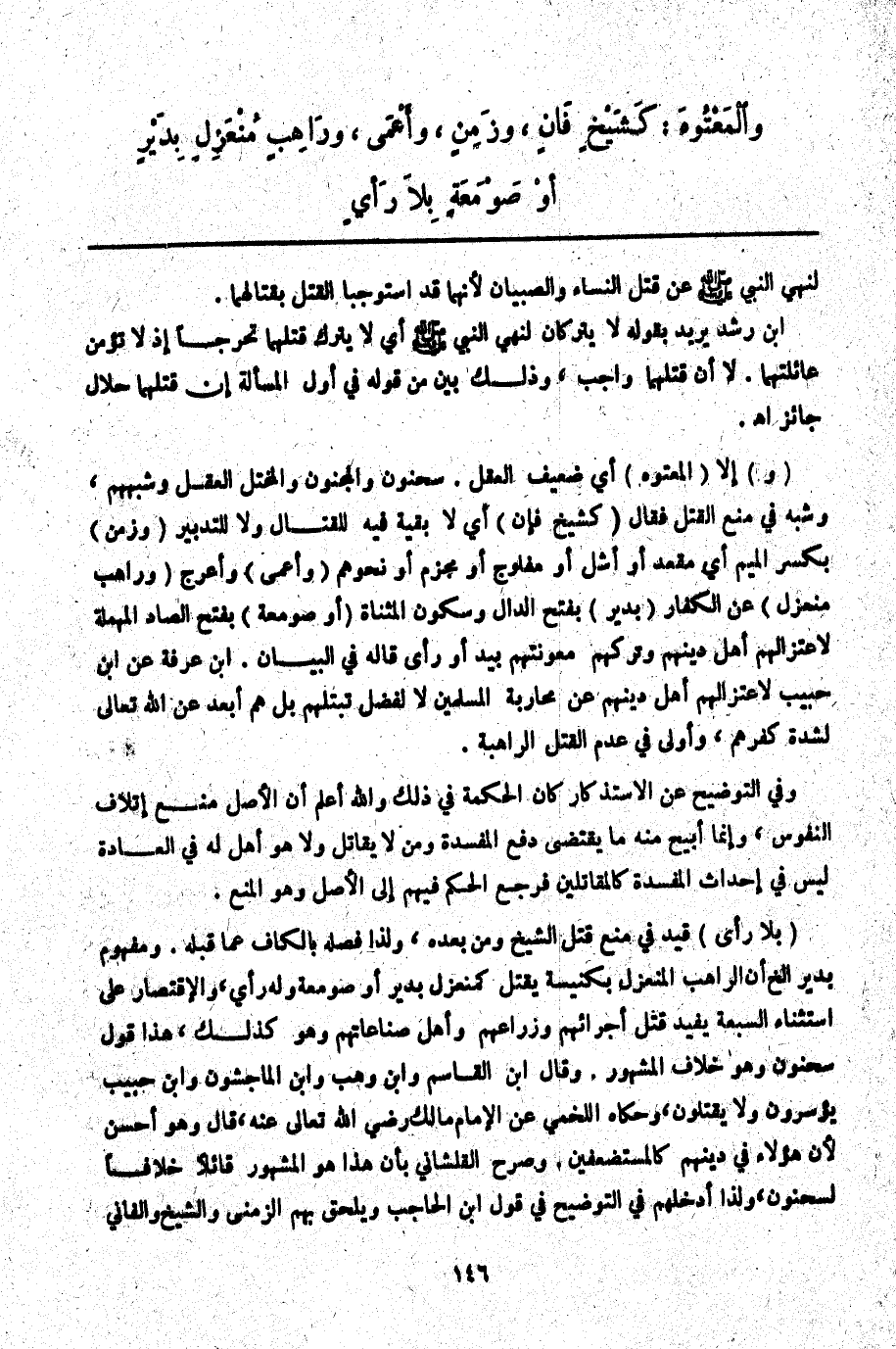 ابْنُ رُشْدٍ يُرِيدُ بِقَوْلِهِ لَا يُتْرَكَانِ لِنَهْيِ النَّبِيِّ - صَلَّى اللَّهُ عَلَيْهِ وَسَلَّمَ - أَيْ لَا يُتْرَكُ قَتْلُهُمَا تَحَرُّجًا إذْ لَا تُؤْمَنُ غَائِلَتُهُمَا. لَا أَنَّ قَتْلَهُمَا وَاجِبٌ، وَذَلِكَ بَيِّنٌ مِنْ قَوْلِهِ فِي أَوَّلِ الْمَسْأَلَةِ إنَّ قَتْلَهُمَا حَلَالٌ جَائِزٌ اهـ (وَ) إلَّا (الْمَعْتُوهَ) أَيْ ضَعِيفَ الْعَقْلِ. سَحْنُونٌ وَالْمَجْنُونَ وَالْمُخْتَلَّ الْعَقْلِ وَشِبْهَهُمْ، وَشَبَّهَ فِي مَنْعِ الْقَتْلِ فَقَالَ (كَشَيْخٍ فَانٍ) أَيْ لَا بَقِيَّةَ فِيهِ لِلْقِتَالِ، وَلَا لِلتَّدْبِيرِ (وَزَمِنٍ) بِكَسْرِ الْمِيمِ أَيْ مُقْعَدٍ أَوْ أَشَلَّ أَوْ مَفْلُوجٍ أَوْ مُجَزَّمٍ أَوْ نَحْوِهِمْ (وَأَعْمَى) وَأَعْرَجَ (وَرَاهِبٍ مُنْعَزِلٍ) عَنْ الْكُفَّارِ (بِدَيْرٍ) بِفَتْحِ الدَّالِ وَسُكُونِ الْمُثَنَّاةِ (أَوْ صَوْمَعَةٍ) بِفَتْحِ الصَّادِ الْمُهْمَلَةِ لِاعْتِزَالِهِمْ أَهْلَ دِينِهِمْ وَتَرْكِهِمْ مَعُونَتَهُمْ بِيَدٍ أَوْ رَأْيٍ قَالَهُ فِي الْبَيَانِ. ابْنُ عَرَفَةَ عَنْ ابْنِ حَبِيبٍ لِاعْتِزَالِهِمْ أَهْلَ دِينِهِمْ عَنْ مُحَارَبَةِ الْمُسْلِمِينَ لَا لِفَضْلِ تَبَتُّلِهِمْ بَلْ هُمْ أَبْعَدُ عَنْ اللَّهِ تَعَالَى لِشِدَّةِ كُفْرِهِمْ وَأَوْلَى فِي عَدَمِ الْقَتْلِ الرَّاهِبَةُ.