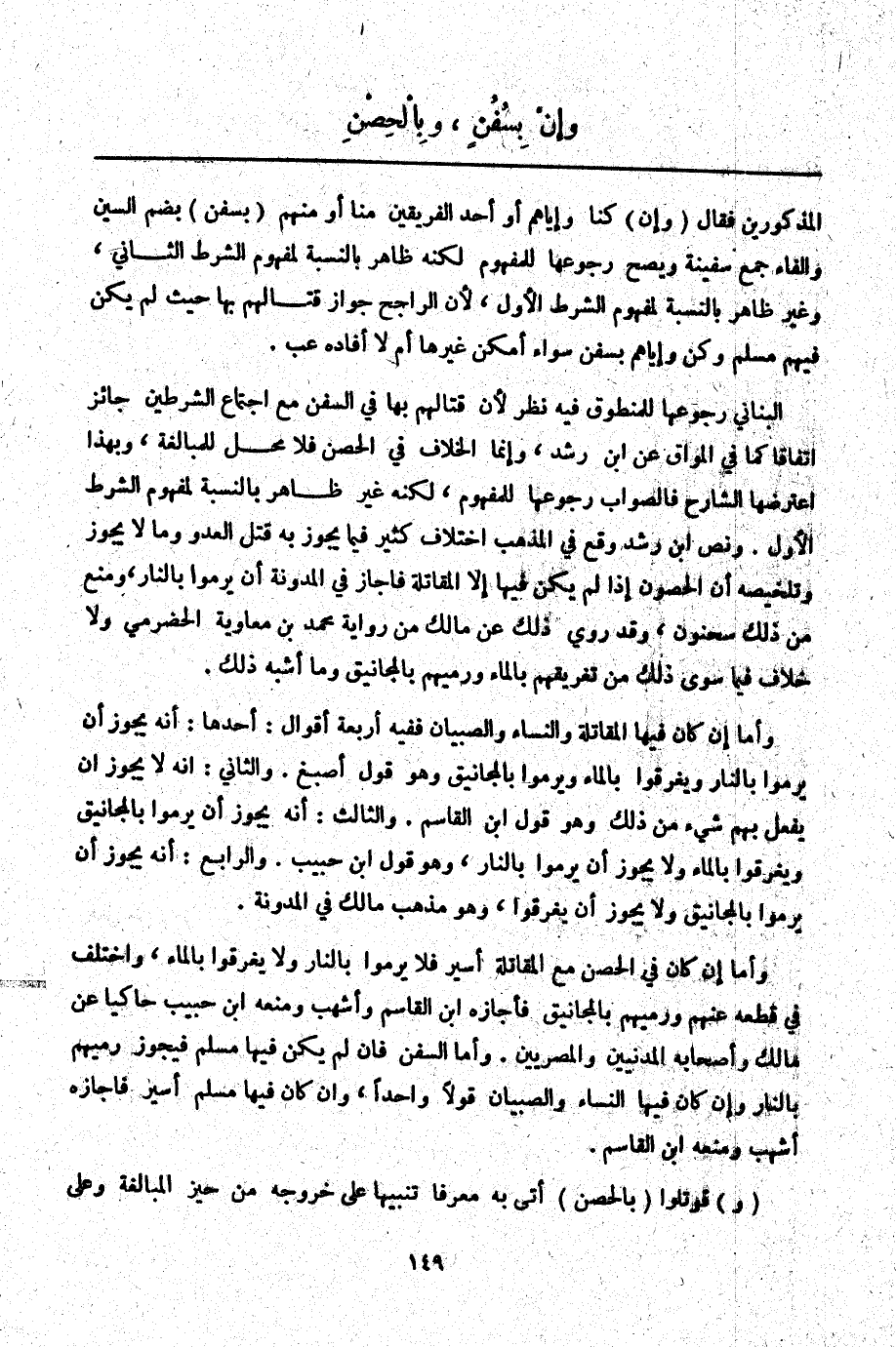 ـــــــــــــــــــــــــــــQالْمَذْكُورَيْنِ فَقَالَ (وَإِنْ) كُنَّا وَإِيَّاهُمْ أَوْ أَحَدُ الْفَرِيقَيْنِ مِنَّا أَوْ مِنْهُمْ (بِسُفُنٍ) بِضَمِّ السِّينِ وَالْفَاءِ جَمْعُ سَفِينَةٍ وَيَصِحُّ رُجُوعُهَا لِلْمَفْهُومِ لَكِنَّهُ ظَاهِرٌ بِالنِّسْبَةِ لِمَفْهُومِ الشَّرْطِ الثَّانِي، وَغَيْرُ ظَاهِرٍ بِالنِّسْبَةِ لِمَفْهُومِ الشَّرْطِ الْأَوَّلِ، لِأَنَّ الرَّاجِحَ جَوَازُ قِتَالِهِمْ بِهَا حَيْثُ لَمْ يَكُنْ فِيهِمْ مُسْلِمٌ، وَكُنَّ وَإِيَّاهُمْ بِسُفُنٍ سَوَاءٌ أَمْكَنَ غَيْرُهَا أَمْ لَا أَفَادَهُ عب.