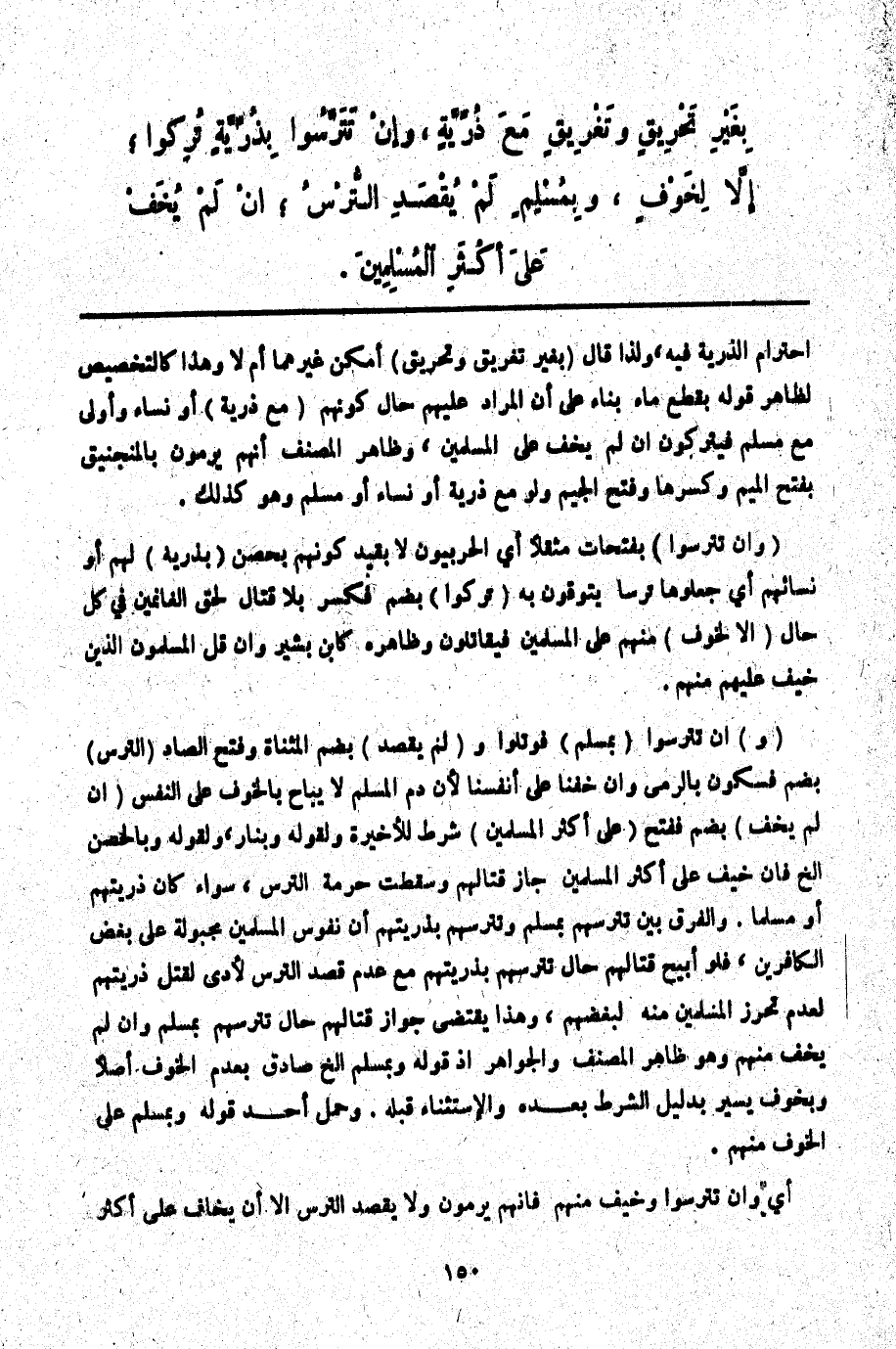 (وَإِنْ تَتَرَّسُوا) بِفَتَحَاتٍ مُثَقَّلًا أَيْ الْحَرْبِيُّونَ لَا بِقَيْدِ كَوْنِهِمْ بِحِصْنٍ (بِذُرِّيَّةٍ) لَهُمْ أَوْ نِسَائِهِمْ أَيْ جَعَلُوهَا تُرْسًا يَتَوَقَّوْنَ بِهِ (تُرِكُوا) بِضَمٍّ فَكَسْرٍ بِلَا قِتَالٍ لِحَقِّ الْغَانِمِينَ فِي كُلِّ حَالٍ (إلَّا لِخَوْفٍ) مِنْهُمْ عَلَى الْمُسْلِمِينَ فَيُقَاتَلُونَ وَظَاهِرُهُ كَابْنِ بَشِيرٍ وَإِنْ قَلَّ الْمُسْلِمُونَ الَّذِينَ خِيفَ عَلَيْهِمْ مِنْهُمْ (وَ) إنْ تَتَرَّسُوا (بِمُسْلِمٍ) قُوتِلُوا وَ (لَمْ يُقْصَدْ) بِضَمِّ الْمُثَنَّاةِ وَفَتْحِ الصَّادِ (التُّرْسُ) بِضَمٍّ فَسُكُونٍ بِالرَّمْيِ وَإِنْ خِفْنَا عَلَى أَنْفُسِنَا؛ لِأَنَّ دَمَ الْمُسْلِمِ لَا يُبَاحُ بِالْخَوْفِ عَلَى النَّفْسِ (إنْ لَمْ يُخَفْ) بِضَمٍّ فَفَتْحٍ (عَلَى أَكْثَرِ الْمُسْلِمِينَ) شَرْطٌ لِلْأَخِيرَةِ وَلِقَوْلِهِ وَبِنَارٍ، وَلِقَوْلِهِ وَبِالْحِصْنِ إلَخْ فَإِنْ خِيفَ عَلَى أَكْثَرِ الْمُسْلِمِينَ جَازَ قِتَالُهُمْ وَسَقَطَتْ حُرْمَةُ التُّرْسِ، سَوَاءٌ كَانَ ذُرِّيَّتَهُمْ أَوْ مُسْلِمًا. وَالْفَرْقُ بَيْنَ تَتَرُّسِهِمْ بِمُسْلِمٍ وَتَتَرُّسِهِمْ بِذُرِّيَّتِهِمْ أَنَّ نُفُوسَ الْمُسْلِمِينَ مَجْبُولَةٌ عَلَى بُغْضِ الْكَافِرِينَ، فَلَوْ أُبِيحَ قِتَالُهُمْ حَالَ تَتَرُّسِهِمْ بِذُرِّيَّتِهِمْ مَعَ عَدَمِ قَصْدِ التُّرْسِ لَأَدَّى لِقَتْلِ ذُرِّيَّتِهِمْ لِعَدَمِ تَحَرُّزِ الْمُسْلِمِينَ مِنْهُ لِبُغْضِهِمْ، وَهَذَا يَقْتَضِي جَوَازَ قِتَالِهِمْ حَالَ تَتَرُّسِهِمْ بِمُسْلِمٍ وَإِنْ لَمْ يُخَفْ مِنْهُمْ وَهُوَ ظَاهِرُ الْمُصَنِّفِ وَالْجَوَاهِرِ إذْ قَوْلُهُ وَبِمُسْلِمٍ إلَخْ صَادِقٌ بِعَدَمِ الْخَوْفِ أَصْلًا وَبِخَوْفٍ يَسِيرٍ بِدَلِيلِ الشَّرْطِ بَعْدَهُ وَالِاسْتِثْنَاءِ قَبْلَهُ. وَحُمِلَ أَحَدُ قَوْلِهِ وَبِمُسْلِمٍ عَلَى الْخَوْفِ مِنْهُمْ.