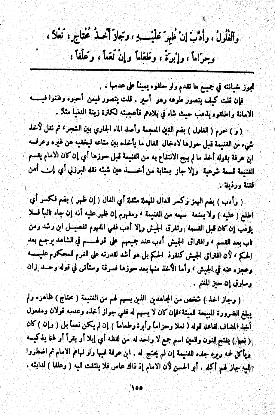 (وَجَازَ أَخْذُ) شَخْصٍ مِنْ الْمُجَاهِدِينَ الَّذِينَ يُسْهَمُ لَهُمْ مِنْ الْغَنِيمَةِ (مُحْتَاجٍ) ظَاهِرُهُ وَلَمْ يَبْلُغْ الضَّرُورَةَ الْمُبِيحَةَ لِلْمَيْتَةِ، فَإِنْ كَانَ لَا يُسْهَمُ لَهُ فَفِي جَوَازِ أَخْذِهِ وَعَدَمِهِ قَوْلَانِ وَمَفْعُولُ أَخْذٍ الْمُضَافُ لِفَاعِلِهِ قَوْلُهُ (نَعْلًا وَحِزَامًا وَإِبْرَةً وَطَعَامًا) إنْ لَمْ يَكُنْ نَعَمًا بَلْ (وَإِنْ) كَانَ (نَعَمًا) بِفَتْحِ النُّونِ وَالْعَيْنِ اسْمُ جَمْعٍ لَا وَاحِدَ لَهُ مِنْ لَفْظِهِ أَيْ إبِلًا أَوْ بَقَرًا أَوْ غَنَمًا يُذَكِّيهِ وَيَأْكُلُ لَحْمَهُ وَيَرُدُّ جِلْدَهُ لِلْغَنِيمَةِ إنْ لَمْ يَحْتَجْ لَهُ. ابْنُ عَرَفَةَ فِيهَا وَلَوْ نَهَاهُمْ الْإِمَامُ ثُمَّ اضْطَرُّوا إلَيْهِ جَازَ لَهُمْ أَكْلُهُ. أَبُو الْحَسَنِ؛ لِأَنَّ الْإِمَامَ إذْ ذَاكَ عَاصٍ فَلَا يُلْتَفَتُ إلَيْهِ (وَعَلَفًا) لِدَابَّتِهِ.