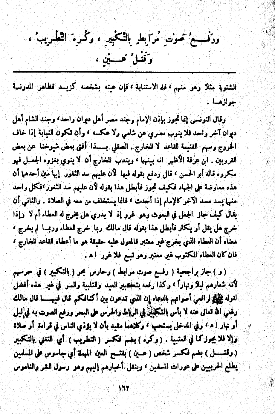 وَرَفْعُ صَوْتِ مُرَابِطٍ بِالتَّكْبِيرِ.
