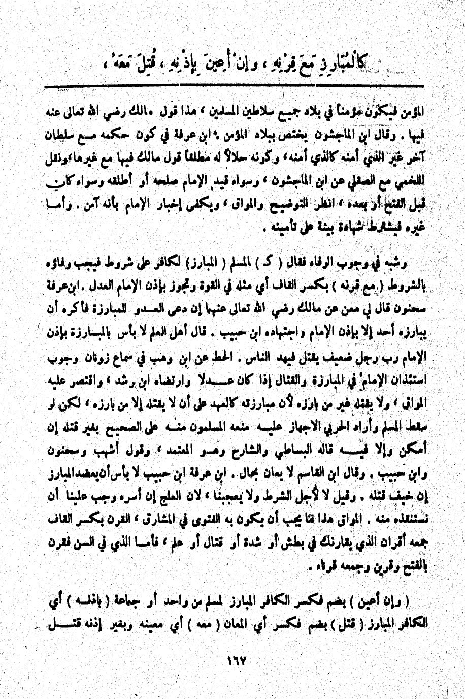 وَشَبَّهَ فِي وُجُوبِ الْوَفَاءِ فَقَالَ (كَ) الْمُسْلِمِ (الْمُبَارِزِ) لِكَافِرٍ عَلَى شُرُوطٍ فَيَجِبُ وَفَاؤُهُ بِالشُّرُوطِ (مَعَ قِرْنِهِ) بِكَسْرِ الْقَافِ أَيْ مِثْلِهِ فِي الْقُوَّةِ وَتَجُوزُ بِإِذْنِ الْإِمَامِ الْعَدْلِ. ابْنُ عَرَفَةَ سَحْنُونٌ قَالَ لِي مَعْنٌ عَنْ مَالِكٍ - رَضِيَ اللَّهُ تَعَالَى عَنْهُمَا - إنْ دَعَا الْعَدُوُّ لِلْمُبَارَزَةِ فَأَكْرَهُ أَنْ يُبَارِزَهُ أَحَدٌ إلَّا بِإِذْنِ الْإِمَامِ وَاجْتِهَادِهِ ابْنُ حَبِيبٍ. قَالَ أَهْلُ الْعِلْمِ لَا بَأْسَ بِالْمُبَارَزَةِ بِإِذْنِ الْإِمَامِ رُبَّ رَجُلٍ ضَعِيفٍ يُقْتَلُ فَيَهُدُّ النَّاسَ. الْحَطّ ابْنُ وَهْبٍ فِي سَمَاعِ زُونَانَ وُجُوبُ اسْتِئْذَانِ الْإِمَامِ فِي الْمُبَارَزَةِ وَالْقِتَالِ إذَا كَانَ عَدْلًا وَارْتَضَاهُ ابْنُ رُشْدٍ، وَاقْتَصَرَ عَلَيْهِ الْمَوَّاقُ، وَلَا يَقْتُلُهُ غَيْرُ مَنْ بَارَزَهُ لِأَنَّ مُبَارَزَتَهُ كَالْعَهْدِ عَلَى أَنْ لَا يَقْتُلَهُ إلَّا مَنْ بَارَزَهُ، لَكِنْ لَوْ سَقَطَ الْمُسْلِمُ وَأَرَادَ الْحَرْبِيُّ الْإِجْهَازَ عَلَيْهِ مَنَعَهُ الْمُسْلِمُونَ مِنْهُ عَلَى الصَّحِيحِ بِغَيْرِ قَتْلِهِ إنْ أَمْكَنَ وَإِلَّا فِيهِ قَالَهُ الْبِسَاطِيُّ وَالشَّارِحُ وَهُوَ الْمُعْتَمَدُ، وَقَوْلُ أَشْهَبَ وَسَحْنُونٍ وَابْنِ حَبِيبٍ. وَقَالَ ابْنُ الْقَاسِمِ لَا يُعَانُ بِحَالٍ. ابْنُ عَرَفَةَ ابْنُ حَبِيبٍ لَا بَأْسَ أَنْ يُعَضَّدَ الْمُبَارِزُ إنْ خِيفَ قَتْلُهُ. وَقِيلَ لَا لِأَجْلِ الشَّرْطِ، وَلَا يُعْجِبُنَا؛ لِأَنَّ الْعِلْجَ إنْ أَسَرَهُ وَجَبَ عَلَيْنَا أَنَّ نَسْتَنْقِذَهُ مِنْهُ. الْمَوَّاقُ هَذَا مَا يَجِبُ أَنْ يَكُونَ بِهِ الْفَتْوَى فِي الْمَشَارِقِ، الْقِرْنُ بِكَسْرِ الْقَافِ جَمْعُهُ أَقْرَانٌ الَّذِي يُقَارِنُك فِي بَطْشٍ أَوْ شِدَّةٍ أَوْ قِتَالٍ أَوْ عِلْمٍ، فَأَمَّا الَّذِي فِي السِّنِّ فَقَرْنٌ بِالْفَتْحِ وَقَرِينٌ وَجَمْعُهُ قُرَنَاءُ.