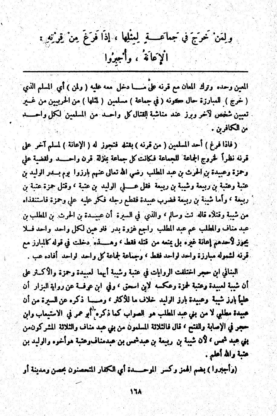 (فَإِذَا فَرَغَ) أَحَدُ الْمُسْلِمِينَ (مِنْ قِرْنِهِ) بِقَتْلِهِ فَتَجُوزُ لَهُ (الْإِعَانَةُ) لِمُسْلِمٍ آخَرَ عَلَى قِرْنِهِ نَظَرًا لِخُرُوجِ الْجَمَاعَةِ لِلْجَمَاعَةِ فَكَانَتْ كُلُّ جَمَاعَةٍ بِمَنْزِلَةِ قِرْنٍ وَاحِدٍ وَلِقَضِيَّةِ عَلِيٍّ وَحَمْزَةَ وَعُبَيْدَةَ بْنِ الْحَارِثِ بْنِ عَبْدِ الْمُطَّلِبِ - رَضِيَ اللَّهُ تَعَالَى عَنْهُمْ - بَارَزُوا يَوْمَ بَدْرٍ الْوَلِيدَ بْنَ عُتْبَةَ وَعُتْبَةَ بْنَ رَبِيعَةَ وَشَيْبَةَ بْنِ رَبِيعَةَ فَقَتَلَ عَلِيٌّ الْوَلِيدِ بْنِ عُتْبَةَ، وَقَتَلَ حَمْزَةُ عُتْبَةَ بْنَ رَبِيعَةَ، وَأَمَّا شَيْبَةُ بْنُ رَبِيعَةَ فَضَرَبَ عُبَيْدَةَ فَقَطَعَ رِجْلَهُ فَكَّرَ عَلَيْهِ عَلِيٌّ وَحَمْزَةُ فَاسْتَنْقَذَاهُ مِنْ شَيْبَةَ وَقَتَلَاهُ قَالَهُ تت وَسَالِمٌ، وَاَلَّذِي فِي السِّيرَةِ أَنَّ عُبَيْدَةَ بْنَ الْحَارِثِ بْنِ الْمُطَّلِبِ بْنِ عَبْدِ مَنَافٍ وَالْمُطَّلِبُ عَمُّ عَبْدِ الْمُطَّلِبِ رَاجِعْ غَزْوَةَ بَدْرٍ فَلَوْ عُيِّنَ لِكُلِّ وَاحِدٍ وَاحِدٌ فَلَا يَجُوزُ لِأَحَدِهِمْ إعَانَةُ غَيْرِهِ بَلْ يَمْنَعُهُ مِنْ قَتْلِهِ فَقَطْ، وَهَذِهِ دَخَلَتْ فِي قَوْلِهِ كَالْمُبَارِزِ مَعَ قِرْنِهِ لِشُمُولِهِ مُبَارَزَةَ وَاحِدٍ لِوَاحِدٍ فَقَطْ، وَجَمَاعَةٍ لِجَمَاعَةٍ كُلُّ وَاحِدٍ لِوَاحِدٍ أَفَادَهُ عب.