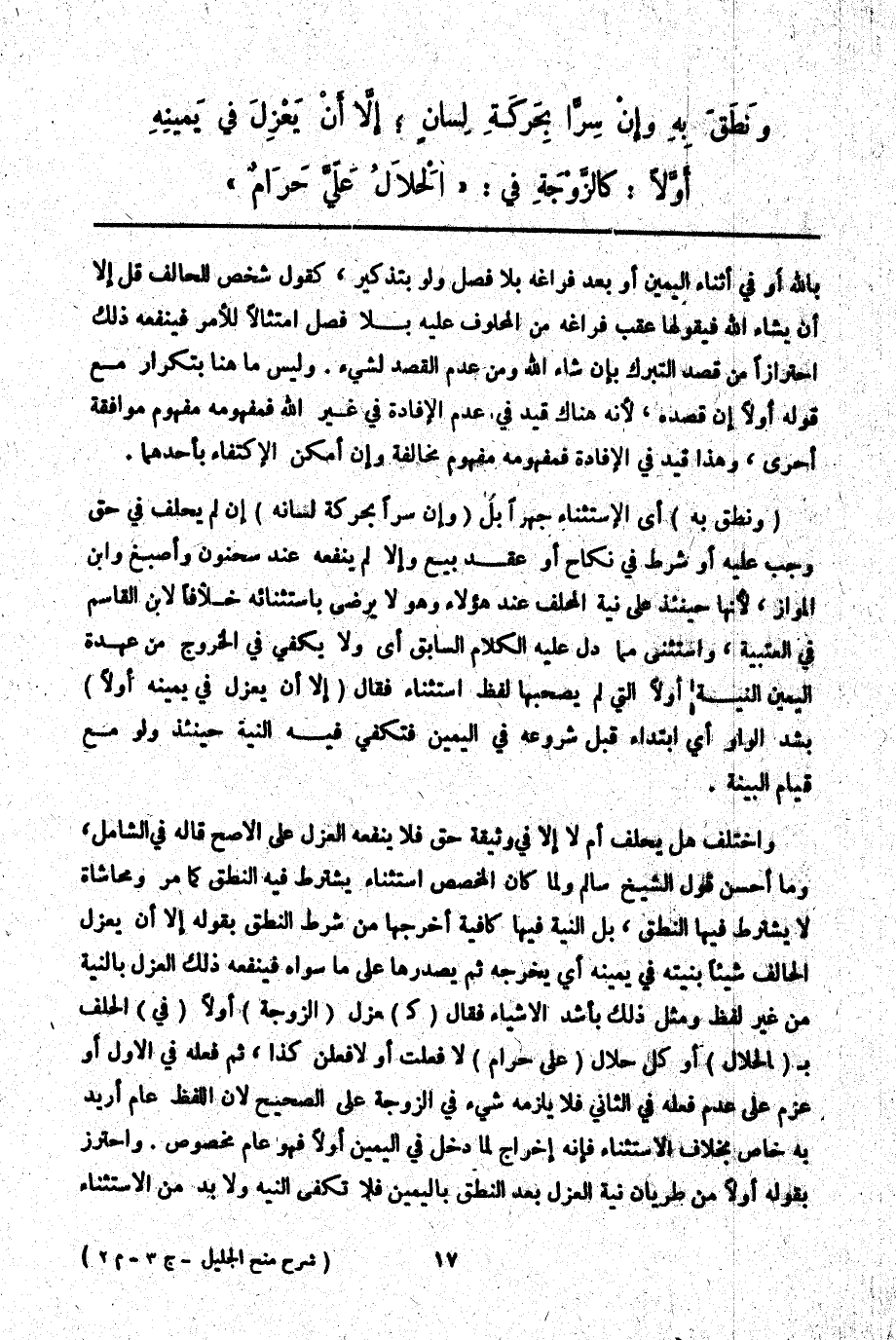 وَاخْتُلِفَ هَلْ يَحْلِفُ أَمْ لَا إلَّا فِي وَثِيقَةِ حَقٍّ فَلَا يَنْفَعُهُ الْعَزْلُ عَلَى الْأَصَحِّ قَالَهُ فِي الشَّامِلِ، وَمَا أَحْسَنَ قَوْلَ الشَّيْخِ سَالِمٍ وَلَمَّا كَانَ الْمُخَصَّصُ اسْتِثْنَاءً يُشْتَرَطُ فِيهِ النُّطْقُ كَمَا مَرَّ وَمُحَاشَاةً لَا يُشْتَرَطُ فِيهَا النُّطْقُ، بَلْ النِّيَّةُ فِيهَا كَافِيَةٌ أَخْرَجَهَا مِنْ شَرْطِ النُّطْقِ بِقَوْلِهِ إلَّا أَنْ يَعْزِلَ الْحَالِفُ شَيْئًا بِنِيَّتِهِ فِي يَمِينِهِ أَيْ يُخْرِجُهُ ثُمَّ يُصْدِرُهَا عَلَى مَا سِوَاهُ فَيَنْفَعُهُ ذَلِكَ الْعَزْلُ بِالنِّيَّةِ مِنْ غَيْرِ لَفْظٍ وَمَثَّلَ ذَلِكَ بِأَشَدِّ الْأَشْيَاءِ فَقَالَ (كَ) عَزْلِ (الزَّوْجَةِ) أَوَّلًا (فِي) الْحَلِفِ بِ (الْحَلَالِ) أَوْ كُلِّ حَلَالٍ (عَلَيَّ حَرَامٌ) لَا فَعَلْت أَوْ لَأَفْعَلَنَّ كَذَا، ثُمَّ فَعَلَهُ فِي الْأَوَّلِ أَوْ عَزَمَ عَلَى عَدَمِ فِعْلِهِ فِي الثَّانِي فَلَا يَلْزَمُهُ شَيْءٌ فِي الزَّوْجَةِ عَلَى الصَّحِيحِ لِأَنَّ اللَّفْظَ عَامٌّ أُرِيدَ بِهِ خَاصٌّ بِخِلَافِ الِاسْتِثْنَاءِ فَإِنَّهُ إخْرَاجٌ لِمَا دَخَلَ فِي الْيَمِينِ أَوَّلًا فَهُوَ عَامٌّ مَخْصُوصٌ. وَاحْتَرَزَ بِقَوْلِهِ أَوَّلًا مِنْ طَرَيَان نِيَّةِ الْعَزْلِ بَعْدَ النُّطْقِ بِالْيَمِينِ فَلَا تَكْفِي النِّيَّةُ وَلَا بُدَّ مِنْ الِاسْتِثْنَاءِ