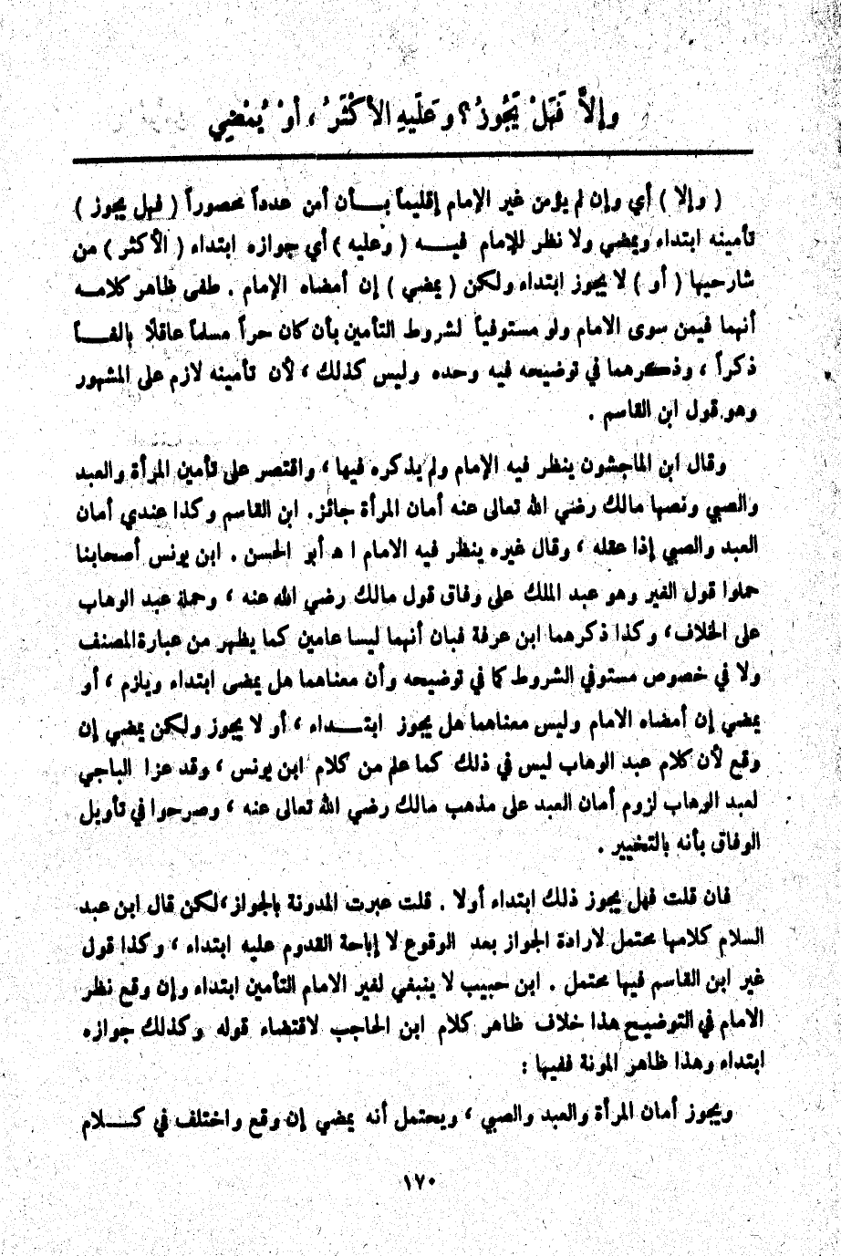 ـــــــــــــــــــــــــــــQوَإِلَّا) أَيْ وَإِنْ لَمْ يُؤَمِّنْ غَيْرُ الْإِمَامِ إقْلِيمًا بِأَنْ أَمَّنَ عَدَدًا مَحْصُورًا (فَهَلْ يَجُوزُ) تَأْمِينُهُ ابْتِدَاءً وَيَمْضِي، وَلَا نَظَرَ لِلْإِمَامِ فِيهِ (وَعَلَيْهِ) أَيْ جَوَازِهِ ابْتِدَاءً (الْأَكْثَرُ) مِنْ شَارِحِيهَا (أَوْ) لَا يَجُوزُ ابْتِدَاءً وَلَكِنْ (يُمْضَى) إنْ أَمْضَاهُ الْإِمَامُ. طفي ظَاهِرُ كَلَامِهِ أَنَّهُمَا فِيمَنْ سِوَى الْإِمَامِ وَلَوْ مُسْتَوْفِيًا لِشُرُوطِ التَّأْمِينِ بِأَنْ كَانَ حُرًّا مُسْلِمًا عَاقِلًا بَالِغًا ذَكَرًا، وَذَكَرَهُمَا فِي تَوْضِيحِهِ فِيهِ وَحْدَهُ وَلَيْسَ كَذَلِكَ؛ لِأَنَّ تَأْمِينَهُ لَازِمٌ عَلَى الْمَشْهُورِ وَهُوَ قَوْلُ ابْنِ الْقَاسِمِ.