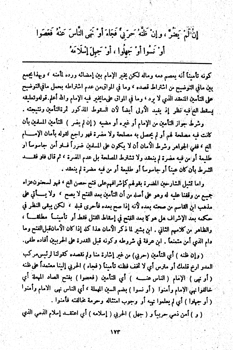وَشَرْطُ جَوَازِ التَّأْمِينِ مِنْ الْإِمَامِ أَوْ غَيْرِهِ أَوْ مُضِيِّهِ (إنْ لَمْ يَضُرُّ) التَّأْمِينُ الْمُسْلِمِينَ بِأَنْ كَانَتْ فِيهِ مَصْلَحَةٌ لَهُمْ أَوْ لَمْ يَحْصُلْ بِهِ مَصْلَحَةٌ، وَلَا مَضَرَّةٌ فَهُوَ رَاجِعٌ لِقَوْلِهِ بِأَمَانِ الْإِمَامِ إلَخْ، فَفِي الْجَوَاهِرِ وَشَرْطُ الْأَمَانِ أَنْ لَا يَكُونَ عَلَى الْمُسْلِمِينَ ضَرَرًا فَلَوْ أَمَّنَ جَاسُوسًا أَوْ طَلِيعَةً أَوْ مَنْ فِيهِ مَضَرَّةٌ لَمْ يَنْعَقِدْ، وَلَا تُشْتَرَطُ الْمَصْلَحَةُ بَلْ عَدَمُ الْمَضَرَّةِ، ثُمَّ قَالَ فَلَوْ فُقِدَ الشَّرْطُ بِأَنْ كَانَ عَيْنًا أَوْ جَاسُوسًا أَوْ طَلِيعَةً أَوْ مَنْ فِيهِ مَضَرَّةٌ لَمْ يَنْعَقِدْ.
