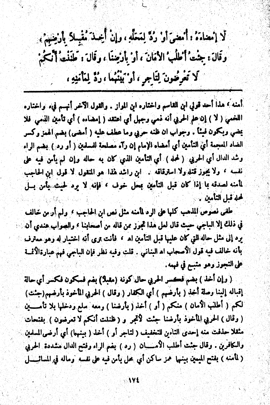 ـــــــــــــــــــــــــــــQأَمَّنَهُ، هَذَا أَحَدُ قَوْلَيْ ابْنِ الْقَاسِمِ وَاخْتَارَهُ ابْنُ الْمَوَّازِ. وَالْقَوْلُ الْآخَرُ أَنَّهُمْ فَيْءٌ وَاخْتَارَهُ اللَّخْمِيُّ (لَا) إنْ عَلِمَ الْحَرْبِيُّ أَنَّهُ ذِمِّيٌّ وَجَهِلَ أَيْ اعْتَقَدَ (إمْضَاءَهُ) أَيْ تَأْمِينَ الذِّمِّيِّ فَلَا يَمْضِي وَيَكُونُ فَيْئًا. وَجَوَابُ إنْ ظَنَّهُ حَرْبِيٌّ وَمَا عُطِفَ عَلَيْهِ (أُمْضِيَ) بِضَمِّ الْهَمْزِ وَكَسْرِ الضَّادِ الْمُعْجَمَةِ أَيْ التَّأْمِينُ أَيْ أَمْضَاهُ الْإِمَامُ إنْ رَآهُ مَصْلَحَةً لِلْمُسْلِمِينَ (أَوْ رُدَّ) بِضَمِّ الرَّاءِ وَشَدِّ الدَّالِ أَيْ الْحَرْبِيُّ (لِمَحَلِّهِ) أَيْ التَّأْمِينِ الَّذِي كَانَ بِهِ حَالُهُ وَإِنْ لَمْ يَأْمَنْ فِيهِ عَلَى نَفْسِهِ، وَلَا يَجُوزُ قَتْلُهُ، وَلَا اسْتِرْقَاقُهُ. ابْنُ رَاشِدٍ هَذَا هُوَ الْمَنْقُولُ لَا قَوْلُ ابْنِ الْحَاجِبِ لِمَأْمَنِهِ لِصِدْقِهِ بِمَا إذَا كَانَ قَبْلَ التَّأْمِينِ بِمَحَلِّ خَوْفٍ، فَإِنَّهُ لَا يُرَدُّ لِحَيْثُ يَأْمَنُ بَلْ لِمَحَلِّهِ قَبْلَ التَّأْمِينِ.