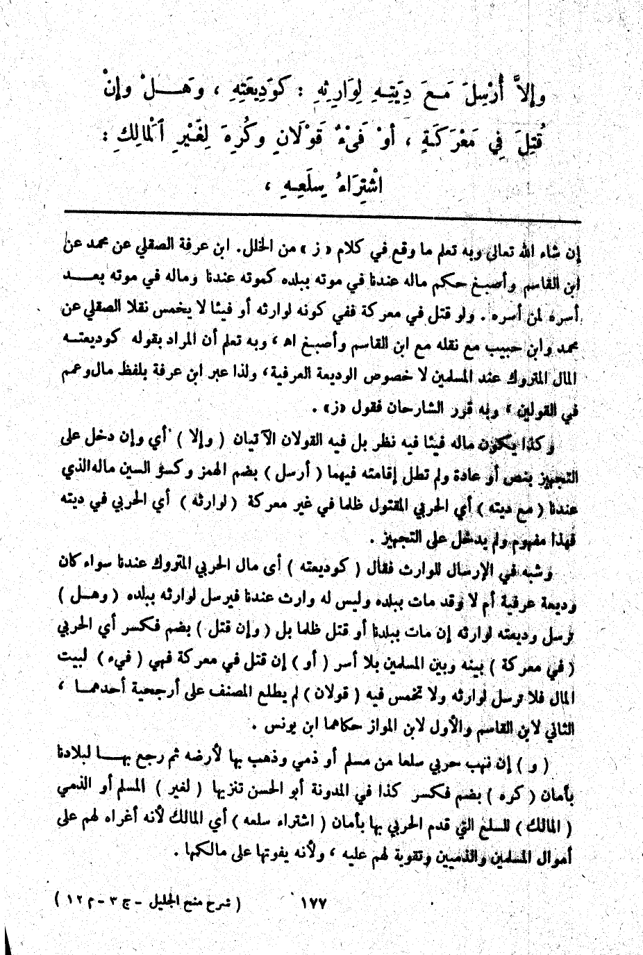 وَشَبَّهَ فِي الْإِرْسَالِ لِلْوَارِثِ فَقَالَ (كَوَدِيعَتِهِ) أَيْ مَالِ الْحَرْبِيِّ الْمَتْرُوكِ عِنْدَنَا سَوَاءٌ كَانَ وَدِيعَةً عُرْفِيَّةً أَمْ لَا وَقَدْ مَاتَ بِبَلَدِهِ وَلَيْسَ لَهُ وَارِثٌ عِنْدَنَا فَيُرْسَلُ لِوَارِثِهِ بِبَلَدِهِ (وَهَلْ) تُرْسَلُ وَدِيعَتُهُ لِوَارِثِهِ إنْ مَاتَ بِبَلَدِنَا أَوْ قُتِلَ ظُلْمًا بَلْ (وَإِنْ قُتِلَ) بِضَمٍّ فَكَسْرٍ أَيْ الْحَرْبِيُّ (فِي مَعْرَكَةٍ) بَيْنَهُ وَبَيْنَ الْمُسْلِمِينَ بِلَا أَسْرٍ (أَوْ) إنْ قُتِلَ فِي مَعْرَكَةٍ فَهِيَ (فَيْءٌ) لِبَيْتِ الْمَالِ فَلَا تُرْسَلُ لِوَارِثِهِ، وَلَا تُخَمَّسُ فِيهِ (قَوْلَانِ) لَمْ يَطَّلِعْ الْمُصَنِّفُ عَلَى أَرْجَحِيَّةِ أَحَدِهِمَا، الثَّانِي لِابْنِ الْقَاسِمِ وَالْأَوَّلُ لِابْنِ الْمَوَّازِ حَكَاهُمَا ابْنُ يُونُسَ.