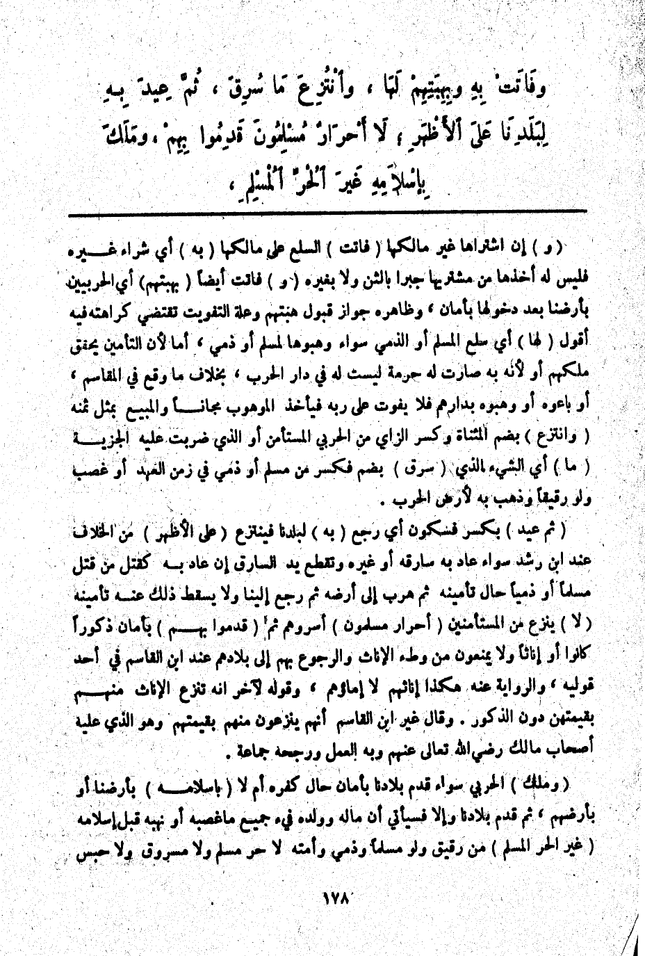 (ثُمَّ عِيدَ) بِكَسْرٍ فَسُكُونٍ أَيْ رُجِعَ (بِهِ) لِبَلَدِنَا فَيُنْتَزَعُ (عَلَى الْأَظْهَرِ) مِنْ الْخِلَافِ عِنْدَ ابْنِ رُشْدٍ سَوَاءٌ عَادَ بِهِ سَارِقُهُ أَوْ غَيْرُهُ وَتُقْطَعُ يَدُ السَّارِقِ إنْ عَادَ بِهِ كَقَتْلِ مَنْ قَتَلَ مُسْلِمًا أَوْ ذِمِّيًّا حَالَ تَأْمِينِهِ ثُمَّ هَرَبَ إلَى أَرْضِهِ ثُمَّ رَجَعَ إلَيْنَا، وَلَا يُسْقِطُ ذَلِكَ عَنْهُ تَأْمِينَهُ (لَا) يُنْزَعُ مِنْ الْمُسْتَأْمَنِينَ (أَحْرَارٌ مُسْلِمُونَ) أَسَرُوهُمْ ثُمَّ (قَدِمُوا بِهِمْ) بِأَمَانٍ ذُكُورًا كَانُوا أَوْ إنَاثًا، وَلَا يُمْنَعُونَ مِنْ وَطْءِ الْإِنَاثِ وَالرُّجُوعِ بِهِمْ إلَى بِلَادِهِمْ عِنْدَ ابْنِ الْقَاسِمِ فِي أَحَدِ قَوْلَيْهِ، وَالرِّوَايَةُ عَنْهُ هَكَذَا إنَاثُهُمْ لَا إمَاؤُهُمْ، وَقَوْلُهُ الْآخَرُ: إنَّهُ تُنْزَعُ الْإِنَاثُ مِنْهُمْ بِقِيمَتِهِنَّ دُونَ الذُّكُورِ. وَقَالَ غَيْرُ ابْنِ الْقَاسِمِ: إنَّهُمْ يُنْزَعُونَ مِنْهُمْ بِقِيمَتِهِمْ وَهُوَ الَّذِي عَلَيْهِ أَصْحَابُ مَالِكٍ - رَضِيَ اللَّهُ تَعَالَى عَنْهُمْ - وَبِهِ الْعَمَلُ وَرَجَّحَهُ جَمَاعَةٌ.