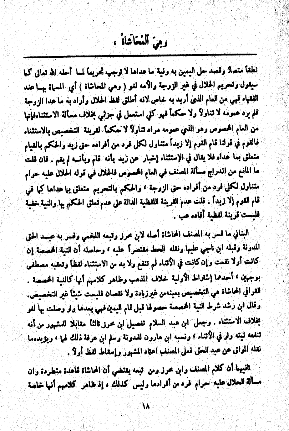 ـــــــــــــــــــــــــــــQنُطْقًا مُتَّصِلًا وَقَصْدُ حِلِّ الْيَمِينِ بِهِ وَنِيَّةُ مَا عَدَاهَا لَا تُوجِبُ تَحْرِيمًا لِمَا أَحَلَّهُ اللَّهُ تَعَالَى كَمَا سَيَقُولُ وَتَحْرِيمُ الْحَلَالِ فِي غَيْرِ الزَّوْجَةِ وَالْأَمَةِ لَغْوٌ (وَهِيَ الْمُحَاشَاةُ) أَيْ الْمُسَمَّاةُ بِهَا عِنْدَ الْفُقَهَاءِ فَهِيَ مِنْ الْعَامِّ الَّذِي أُرِيدَ بِهِ خَاصٌّ لِأَنَّهُ أَطْلَقَ لَفْظَ الْحَلَالِ وَأَرَادَ بِهِ مَا عَدَا الزَّوْجَةَ فَلَمْ يُرِدْ عُمُومَهُ لَا تَنَاوُلًا وَلَا حُكْمًا فَهُوَ كُلِّيٌّ اُسْتُعْمِلَ فِي جُزْئِيٍّ بِخِلَافِ مَسْأَلَةِ الِاسْتِثْنَاءِ فَإِنَّهَا مِنْ الْعَامِّ الْمَخْصُوصِ وَهُوَ الَّذِي عُمُومُهُ مُرَادٌ تَنَاوُلًا لَا حُكْمًا لِقَرِينَةِ التَّخْصِيصِ بِالِاسْتِثْنَاءِ فَالْقَوْمُ فِي قَوْلِنَا قَامَ الْقَوْمُ إلَّا زَيْدًا مُتَنَاوِلٌ لِكُلِّ فَرْدٍ مِنْ أَفْرَادِهِ حَتَّى زَيْدٍ وَالْحُكْمُ بِالْقِيَامِ مُتَعَلِّقٌ بِمَا عَدَاهُ فَلَا يُقَالُ فِي الِاسْتِثْنَاءِ إخْبَارٌ عَنْ زَيْدٍ بِأَنَّهُ قَامَ وَبِأَنَّهُ لَمْ يَقُمْ. فَإِنْ قُلْت مَا الْمَانِعُ مِنْ انْدِرَاجِ مَسْأَلَةِ الْمُصَنِّفِ فِي الْعَامِّ الْمَخْصُوصِ فَالْحَلَالُ فِي قَوْلِهِ الْحَلَالُ عَلَيْهِ حَرَامٌ مُتَنَاوِلٌ لِكُلِّ فَرْدٍ مِنْ أَفْرَادِهِ حَتَّى الزَّوْجَةِ، وَالْحُكْمُ بِالتَّحْرِيمِ مُتَعَلِّقٌ بِمَا عَدَاهَا كَمَا فِي قَامَ الْقَوْمُ إلَّا زَيْدًا. قُلْت عَدَمُ الْقَرِينَةِ اللَّفْظِيَّةِ الدَّالَّةِ عَلَى عَدَمِ تَعَلُّقِ الْحُكْمِ بِهَا، وَالنِّيَّةُ خَفِيَّةٌ فَلَيْسَتْ قَرِينَةً لَفْظِيَّةً أَفَادَهُ عب.