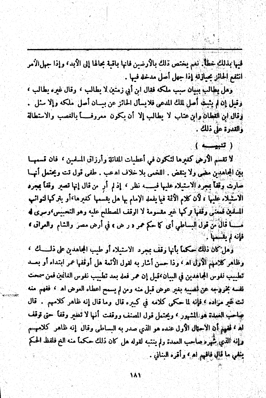 وَهَلْ كَانَ ذَلِكَ حُكْمًا بِأَنَّهَا وَقْفٌ بِمُجَرَّدِ الِاسْتِيلَاءِ أَوْ طِيبِ الْمُجَاهِدِينَ عَلَى ذَلِكَ وَظَاهِرُ كَلَامِهِمْ الْأَوَّلُ. اهـ. وَذَا حَسَنٌ أَشَارَ بِهِ لِقَوْلِ الْأَئِمَّةِ هَلْ أَوْقَفَهَا عُمَرُ ابْتِدَاءً أَوْ بَعْدَ تَطْيِيبِ نُفُوسِ الْمُجَاهِدِينَ فِي الْبَيَانِ، قِيلَ إنَّ عُمَرَ فَعَلَهُ بَعْدَ تَطْيِيبِ نُفُوسِ الْغَانِمِينَ فَمَنْ سَمَحَتْ نَفْسُهُ بِخُرُوجِهِ عَنْ نَصِيبِهِ بِغَيْرِ عِوَضٍ قُبِلَ مِنْهُ وَمَنْ لَمْ يَسْمَحْ أَعْطَاهُ الْعِوَضَ. اهـ. فَفُهِمَ مِنْهُ تت غَيْرُ مُرَادِهِ، فَإِنَّهُ لَمَّا حَكَى كَلَامَهُ فِي كَبِيرِهِ قَالَ مَا قَالَ إنَّهُ ظَاهِرُ كَلَامِهِمْ. قَالَ صَاحِبُ الْعُمْدَةِ هُوَ الْمَشْهُورُ، وَيَحْتَمِلُ قَوْلُ الْمُصَنِّفِ وَوُقِفَتْ أَنَّهَا لَا تَصِيرُ وَقْفًا حَتَّى تُوقَفَ. اهـ. فَفُهِمَ أَنَّ الِاحْتِمَالَ الْأَوَّلَ عِنْدَهُ هُوَ الَّذِي صَدَّرَ بِهِ الْبِسَاطِيُّ وَقَالَ إنَّهُ ظَاهِرُ كَلَامِهِمْ وَإِنَّهُ الَّذِي شَهَرَهُ صَاحِبُ الْعُمْدَةِ وَلَمْ يَنْتَبِهْ لِقَوْلِهِ هَلْ كَانَ ذَلِكَ حُكْمًا مِنْهُ إلَخْ فَلَفْظُ الْحُكْمِ يَنْفِي مَا قَالَ فَافْهَمْ. اهـ. وَأَقَرَّهُ الْبُنَانِيُّ.