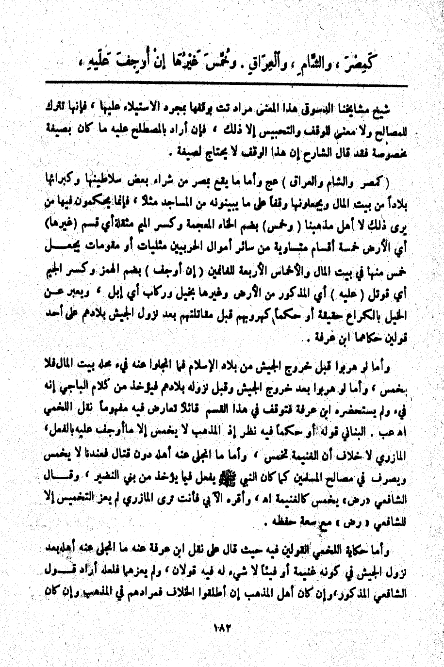 (كَمِصْرِ وَالشَّامِ وَالْعِرَاقِ) عج وَأَمَّا مَا يَقَعُ بِمِصْرَ مِنْ شِرَاءِ بَعْضِ سَلَاطِينِهَا وَكُبَرَائِهَا بِلَادًا مِنْ بَيْتِ الْمَالِ وَيَجْعَلُونَهَا وَقْفًا عَلَى مَا يَبْنُونَهُ مِنْ الْمَسَاجِدِ مَثَلًا، فَإِنَّمَا يُحَكِّمُونَ فِيهَا مَنْ يَرَى ذَلِكَ لَا أَهْلَ مَذْهَبِنَا (وَخُمِّسَ) بِضَمِّ الْخَاءِ الْمُعْجَمَةِ وَكَسْرِ الْمِيمِ مُثَقَّلَةً أَيْ قُسِمَ (غَيْرُهَا) أَيْ الْأَرْضِ خَمْسَةَ أَقْسَامٍ مُتَسَاوِيَةٍ مِنْ سَائِرِ أَمْوَالِ الْحَرْبِيِّينَ مِثْلِيَّاتٍ أَوْ مُقَوَّمَاتٍ يُجْعَلُ خُمُسٌ مِنْهَا فِي بَيْتِ الْمَالِ وَالْأَخْمَاسُ الْأَرْبَعَةُ لِلْغَانِمِينَ (إنْ أُوجِفَ) بِضَمِّ الْهَمْزِ وَكَسْرِ الْجِيمِ أَيْ قُوتِلَ (عَلَيْهِ) أَيْ الْمَذْكُورِ مِنْ الْأَرْضِ وَغَيْرِهَا بِخَيْلٍ وَرِكَابٍ أَيْ إبِلٍ، وَيُعَبَّرُ عَنْ الْخَيْلِ بِالْكُرَاعِ حَقِيقَةً أَوْ حُكْمًا كَهُرُوبِهِمْ قِيلَ مُقَاتَلَتُهُمْ بَعْدَ نُزُولِ الْجَيْشِ بِلَادَهُمْ عَلَى أَحَدِ قَوْلَيْنِ حَكَاهُمَا ابْنُ عَرَفَةَ.