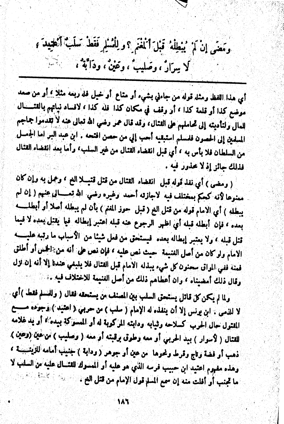 وَلَمَّا لَمْ يَكُنْ كُلُّ قَاتِلٍ يَسْتَحِقُّ السَّلَبَ بَيَّنَ الْمُصَنِّفِ مَنْ يَسْتَحِقُّهُ فَقَالَ (وَلِلْمُسْلِمِ فَقَطْ) أَيْ لَا لِلذِّمِّيِّ. ابْنُ يُونُسَ إلَّا أَنْ يُنْفِذَهُ لَهُ الْإِمَامُ (سَلَبٌ) مِنْ حَرْبِيٍّ (اُعْتِيدَ) وُجُودُهُ مَعَ الْمَقْتُولِ حَالَ الْحَرْبِ كَسِلَاحِهِ وَثِيَابِهِ وَدَابَّتِهِ الْمَرْكُوبَةِ لَهُ أَوْ الْمَمْسُوكَةِ بِيَدِهِ، أَوْ يَدِ غُلَامِهِ لِلْقِتَالِ (لَا سِرَارٌ) بِيَدِ الْحَرْبِيِّ أَوْ مَعَهُ وَطَوْقٌ بِرَقَبَتِهِ أَوْ مَعَهُ (وَصَلِيبٌ) مِنْ عَيْنٍ (وَعَيْنٌ) ذَهَبٍ أَوْ فِضَّةٍ وَتَاجٍ وَقُرْطٍ وَنَحْوِهَا مِنْ عَيْنٍ أَوْ جَوْهَرٍ (وَدَابَّةٌ) جَنِيبٌ أَمَامَهُ لِلزِّينَةِ، وَهَذِهِ مَفْهُومُ اُعْتِيدَ ابْنُ حَبِيبٍ فَرَسُهُ الَّذِي هُوَ عَلَيْهِ أَوْ الْمَمْسُوكُ لِلْقِتَالِ عَلَيْهِ مِنْ السَّلَبِ لَا مَا تَجَنَّبَ أَوْ أَفْلَتَ مِنْهُ إنْ سَمِعَ الْمُسْلِمُ قَوْلَ الْإِمَامِ مَنْ قَتَلَ إلَخْ.