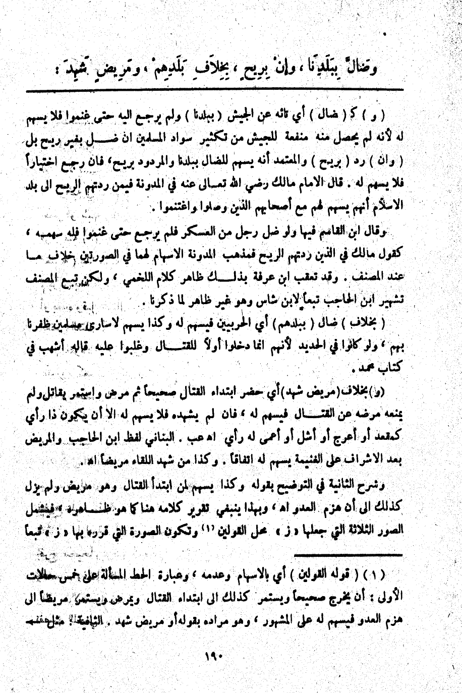 وَشَرَحَ الثَّانِيَةَ فِي التَّوْضِيحِ بِقَوْلِهِ وَكَذَا يُسْهَمُ لِمَنْ ابْتَدَأَ الْقِتَالَ وَهُوَ مَرِيضٌ وَلَمْ يَزَلْ كَذَلِكَ إلَى أَنْ هُزِمَ الْعَدُوُّ. اهـ. وَبِهَذَا يَنْبَغِي تَقْرِيرُ كَلَامِهِ هُنَا كَمَا هُوَ ظَاهِرُهُ، فَيَشْمَلُ الصُّوَرَ الثَّلَاثَةَ الَّتِي جَعَلَهَا " ز " مَحَلَّ الْقَوْلَيْنِ وَتَكُونُ الصُّورَةُ الَّتِي قَرَّرَهُ بِهَا " ز " تَبَعًا
