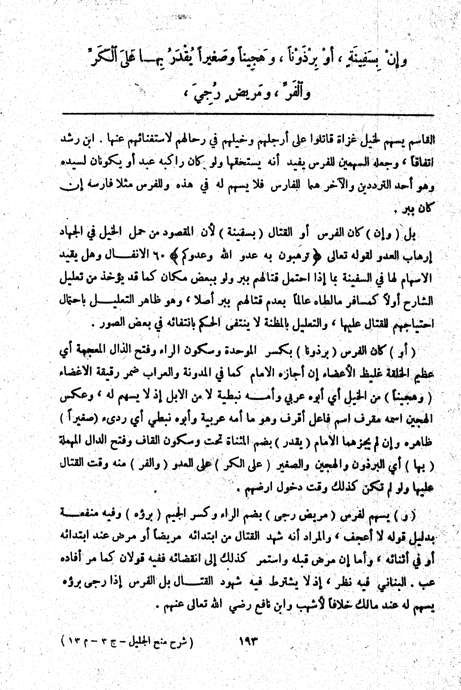 بَلْ (وَإِنْ) كَانَ الْفَرَسُ أَوْ الْقِتَالُ (بِسَفِينَةٍ) ؛ لِأَنَّ الْمَقْصُودَ مِنْ حَمْلِ الْخَيْلِ فِي الْجِهَادِ إرْهَابُ الْعَدُوِّ لِقَوْلِهِ تَعَالَى {تُرْهِبُونَ بِهِ عَدُوَّ اللَّهِ وَعَدُوَّكُمْ} [الأنفال: 60] وَهَلْ يُقَيَّدُ الْإِسْهَامُ لَهَا فِي السَّفِينَةِ بِمَا إذَا اُحْتُمِلَ قِتَالُهُمْ بِبَرٍّ وَلَوْ بِبَعْضِ مَكَان كَمَا قَدْ يُؤْخَذُ مِنْ تَعْلِيلِ الشَّارِحِ أَوَّلًا كَمُسَافِرٍ مَالْطَاةَ عَالِمًا بِعَدَمِ قِتَالِهِمْ بِبَرٍّ أَصْلًا، وَهُوَ ظَاهِرُ التَّعْلِيلِ بِاحْتِمَالِ احْتِيَاجِهِمْ لِلْقِتَالِ عَلَيْهَا، وَالتَّعْلِيلُ بِالْمَظِنَّةِ لَا يَنْتَفِي الْحُكْمُ بِانْتِفَائِهِ فِي بَعْضِ الصُّوَرِ (أَوْ) كَانَ الْفَرَسُ (بِرْذَوْنًا) بِكَسْرِ الْمُوَحَّدَةِ وَسُكُونِ الرَّاءِ وَفَتْحِ الذَّالِ الْمُعْجَمَةِ أَيْ عَظِيمَ الْخِلْقَةِ غَلِيظَ الْأَعْضَاءِ إنْ أَجَازَهُ الْإِمَامُ كَمَا فِي الْمُدَوَّنَةِ وَالْعِرَابُ ضُمَّرٌ رَقِيقَةُ الْأَعْضَاءِ (وَهَجِينًا) مِنْ الْخَيْلِ أَيْ أَبُوهُ عَرَبِيٌّ وَأُمُّهُ نَبَطِيَّةٌ لَا مِنْ الْإِبِلِ إذْ لَا يُسْهَمُ لَهُ، وَعَكْسُ الْهَجِينِ اسْمُهُ مُقْرِفٌ اسْمُ فَاعِلِ أَقْرَفَ وَهُوَ مَا أُمُّهُ عَرَبِيَّةٌ وَأَبُوهُ نَبَطِيٌّ أَيْ رَدِيءٌ (صَغِيرًا) ظَاهِرُهُ، وَإِنْ لَمْ يُجِزْهُمَا الْإِمَامُ (يُقْدَرُ) بِضَمِّ الْمُثَنَّاةِ تَحْتُ وَسُكُونِ الْقَافِ وَفَتْحِ الدَّالِ الْمُهْمَلَةِ (بِهَا) أَيْ الْبِرْذَوْنُ وَالْهَجِينُ وَالصَّغِيرُ (عَلَى الْكَرِّ) عَلَى الْعَدُوِّ (وَالْفَرِّ) مِنْهُ وَقْتَ الْقِتَالِ عَلَيْهَا وَلَوْ لَمْ تَكُنْ كَذَلِكَ وَقْتَ دُخُولِ أَرْضِهِمْ.