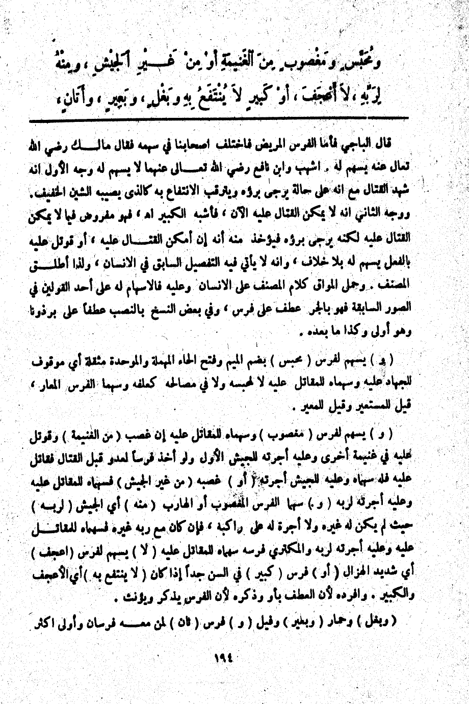 ـــــــــــــــــــــــــــــQقَالَ الْبَاجِيَّ فَأَمَّا الْفَرَسُ الْمَرِيضُ فَاخْتَلَفَ أَصْحَابُنَا فِي سَهْمِهِ فَقَالَ مَالِكٌ - رَضِيَ اللَّهُ تَعَالَى عَنْهُ - يُسْهَمُ لَهُ. أَشْهَبُ وَابْنُ نَافِعٍ - رَضِيَ اللَّهُ تَعَالَى عَنْهُمَا - لَا يُسْهَمُ لَهُ وَجْهُ الْأَوَّلِ أَنَّهُ شَهِدَ الْقِتَالَ مَعَ أَنَّهُ عَلَى حَالَةٍ يُرْجَى بُرْؤُهُ وَيُتَرَقَّبُ الِانْتِفَاعُ بِهِ كَاَلَّذِي يُصِيبُهُ الشَّيْنُ الْخَفِيفُ.