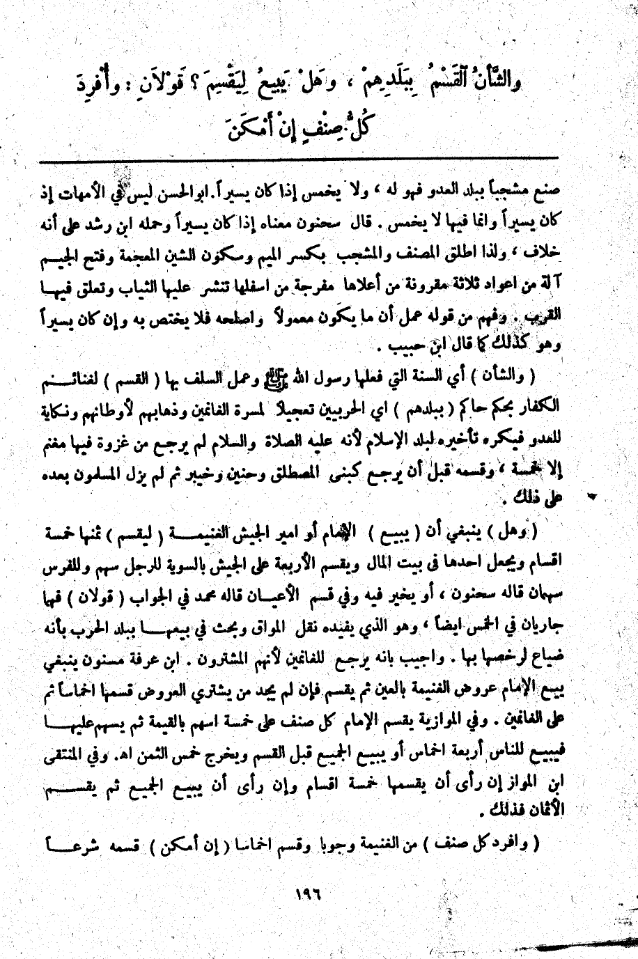 (وَالشَّأْنُ) أَيْ السُّنَّةُ الَّتِي فَعَلَهَا رَسُولُ اللَّهِ - صَلَّى اللَّهُ عَلَيْهِ وَسَلَّمَ - وَعَمِلَ السَّلَفُ بِهَا (الْقَسْمُ) لِغَنَائِمِ الْكُفَّارِ بِحُكْمِ حَاكِمٍ (بِبَلَدِهِمْ) أَيْ الْحَرْبِيِّينَ تَعْجِيلًا لِمَسَرَّةِ الْغَانِمِينَ وَذَهَابِهِمْ لِأَوْطَانِهِمْ وَنِكَايَةً لِلْعَدُوِّ فَيُكْرَهُ تَأْخِيرُهُ لِبَلَدِ الْإِسْلَامِ «؛ لِأَنَّهُ - عَلَيْهِ الصَّلَاةُ وَالسَّلَامُ - لَمْ يَرْجِعْ مِنْ غَزْوَةٍ فِيهَا مَغْنَمٌ إلَّا خَمَّسَهُ، وَقَسَّمَهُ قَبْلَ أَنْ يَرْجِعَ كَبَنِي الْمُصْطَلِقِ وَحُنَيْنٍ وَخَيْبَرَ» ثُمَّ لَمْ يَزَلْ الْمُسْلِمُونَ بَعْدَهُ عَلَى ذَلِكَ.