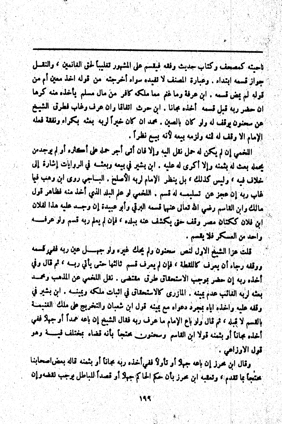 ـــــــــــــــــــــــــــــQنَاحِيَتِهِ كَمُصْحَفٍ وَكِتَابِ حَدِيثٍ وَفِقْهٍ فَيُقْسَمُ عَلَى الْمَشْهُورِ تَغْلِيبًا لِحَقِّ الْغَانِمِينَ، وَالنَّقْلُ جَوَازُ قَسْمِهِ ابْتِدَاءً. وَعِبَارَةُ الْمُصَنِّفِ لَا تُفِيدُهُ سَوَاءٌ أَخْرَجْته مِنْ قَوْلِهِ أَخَذَ مُعَيَّنٌ أَمْ مِنْ قَوْلِهِ لَمْ يُمْضَ قَسْمُهُ. ابْنُ عَرَفَةَ وَمَا غُنِمَ مِمَّا مَلَكَهُ كَافِرٌ مِنْ مَالِ مُسْلِمٍ يَأْخُذُهُ مِنْهُ كُرْهًا إنْ حَضَرَ رَبُّهُ قَبْلَ قَسْمِهِ أَخَذَهُ مَجَّانًا. ابْنُ حَارِثٍ اتِّفَاقًا وَإِنْ عُرِفَ وَغَابَ فَطُرُقُ الشَّيْخِ عَنْ سَحْنُونٌ يُوقَفُ لَهُ وَلَوْ كَانَ بِالصِّينِ. مُحَمَّدٌ إنْ كَانَ خَيْرًا لِرَبِّهِ بَعْثُهُ بِكِرَاءٍ وَنَفَقَةٍ فَعَلَهُ الْإِمَامُ وَإِلَّا وَقَفَ لَهُ ثَمَنَهُ وَلَزِمَهُ بَيْعُهُ؛ لِأَنَّهُ بِيعَ نَظَرًا.