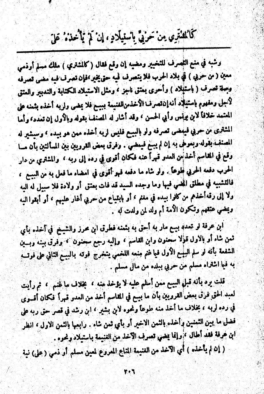 قُلْت يُرَدُّ بِأَنَّهُ قَبْلَ الْبَيْعِ مِمَّنْ أَسْلَمَ عَلَيْهِ لَا يُؤْخَذُ مِنْهُ، بِخِلَافِ مَا غَنِمَ، ثُمَّ رَأَيْت لِعَبْدِ الْحَقِّ فَرَّقَ بَعْضُ الْقَرَوِيِّينَ بِأَنَّ مَا بِيعَ فِي الْمَقَاسِمِ أُخِذَ مِنْ الْعَدُوِّ قَهْرًا فَكَانَ أَقْوَى فِي رَدِّهِ لِرَبِّهِ، بِخِلَافِ مَا أُخِذَ مِنْهُ طَوْعًا وَنَحْوُهُ لِابْنِ بَشِيرٍ ابْنِ رُشْدٍ فِي قَصْرِ حَقِّ رَبِّهِ عَلَى فَضْلِ مَا بَيْنَ الثَّمَنَيْنِ وَأَخْذِهِ بِالثَّمَنِ الْأَخِيرِ أَوْ بِأَيِّ ثَمَنٍ شَاءَ. رَابِعُهَا بِالثَّمَنِ الْأَوَّلِ، اُنْظُرْ ابْنَ عَرَفَةَ فَقَدْ أَطَالَ، وَإِنَّمَا يَمْضِي تَصَرُّفُ الْآخِذِ مِنْ الْغَنِيمَةِ بِاسْتِيلَادٍ وَنَحْوِهِ.