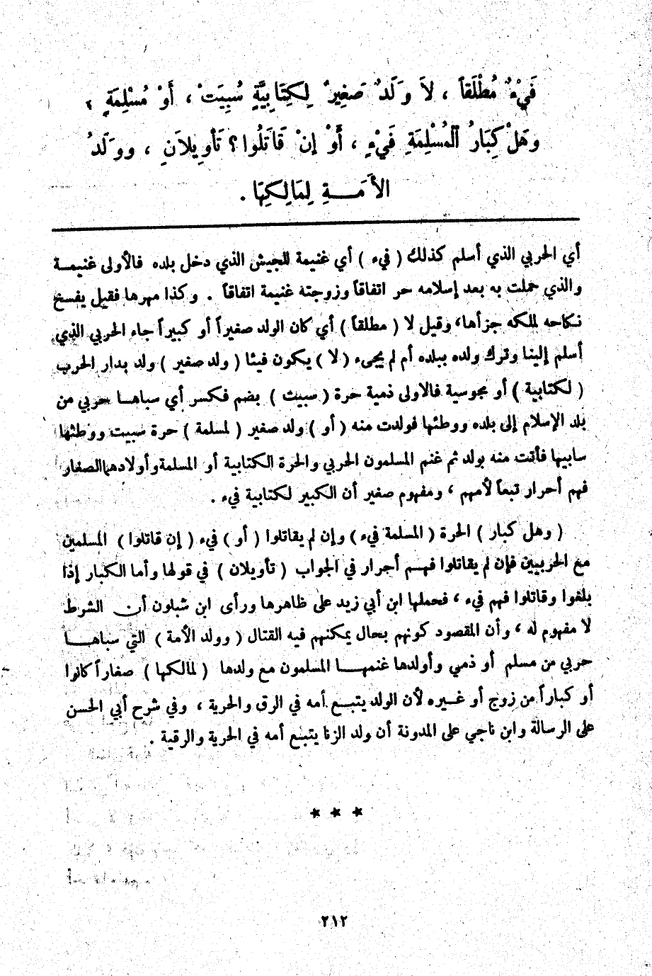 ـــــــــــــــــــــــــــــQأَيْ الْحَرْبِيِّ الَّذِي أَسْلَمَ كَذَلِكَ (فَيْءٌ) أَيْ غَنِيمَةٌ لِلْجَيْشِ الَّذِي دَخَلَ بَلَدَهُ فَالْأَوْلَى غَنِيمَةٌ وَاَلَّذِي حَمَلَتْ بِهِ بَعْدَ إسْلَامِهِ حُرٌّ اتِّفَاقًا وَزَوْجَتُهُ غَنِيمَةٌ اتِّفَاقًا. وَكَذَا مَهْرُهَا فَقِيلَ يُفْسَخُ نِكَاحُهُ لِمِلْكِهِ جُزْأَهَا، وَقِيلَ لَا (مُطْلَقًا) أَيْ كَانَ الْوَلَدُ صَغِيرًا أَوْ كَبِيرًا جَاءَ الْحَرْبِيُّ الَّذِي أَسْلَمَ إلَيْنَا وَتَرَكَ وَلَدَهُ بِبَلَدِهِ أَمْ لَمْ يَجِئْ (لَا) يَكُونُ فَيْئًا (وَلَدٌ صَغِيرٌ) وُلِدَ بِدَارِ الْحَرْبِ (لِكِتَابِيَّةٍ) أَوْ مَجُوسِيَّةٍ فَالْأَوْلَى ذِمِّيَّةٌ حُرَّةٌ (سُبِيَتْ) بِضَمٍّ فَكَسْرٍ أَيْ سَبَاهَا حَرْبِيٌّ مِنْ بَلَدِ الْإِسْلَامِ إلَى بَلَدِهِ وَوَطِئَهَا فَوَلَدَتْ مِنْهُ (أَوْ) وَلَدٌ صَغِيرٌ (لِمُسْلِمَةٍ) حُرَّةٍ سُبِيَتْ وَوَطِئَهَا سَابِيهَا فَأَتَتْ مِنْهُ بِوَلَدٍ ثُمَّ غَنِمَ الْمُسْلِمُونَ الْحَرْبِيَّ وَالْحُرَّةَ الْكِتَابِيَّةَ أَوْ الْمُسْلِمَةَ وَأَوْلَادَهُمَا الصِّغَارَ فَهُمْ أَحْرَارٌ تَبَعًا لِأُمِّهِمْ، وَمَفْهُومُ صَغِيرٍ أَنَّ الْكَبِيرَ لِكِتَابِيَّةٍ فَيْءٌ.