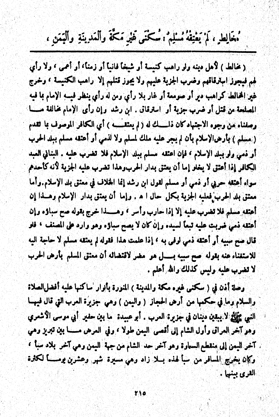 مُخَالِطٍ، لَمْ يُعْتِقْهُ مُسْلِمٌ سُكْنَى غَيْرِ مَكَّةَ وَالْمَدِينَةِ وَالْيَمَنِ.