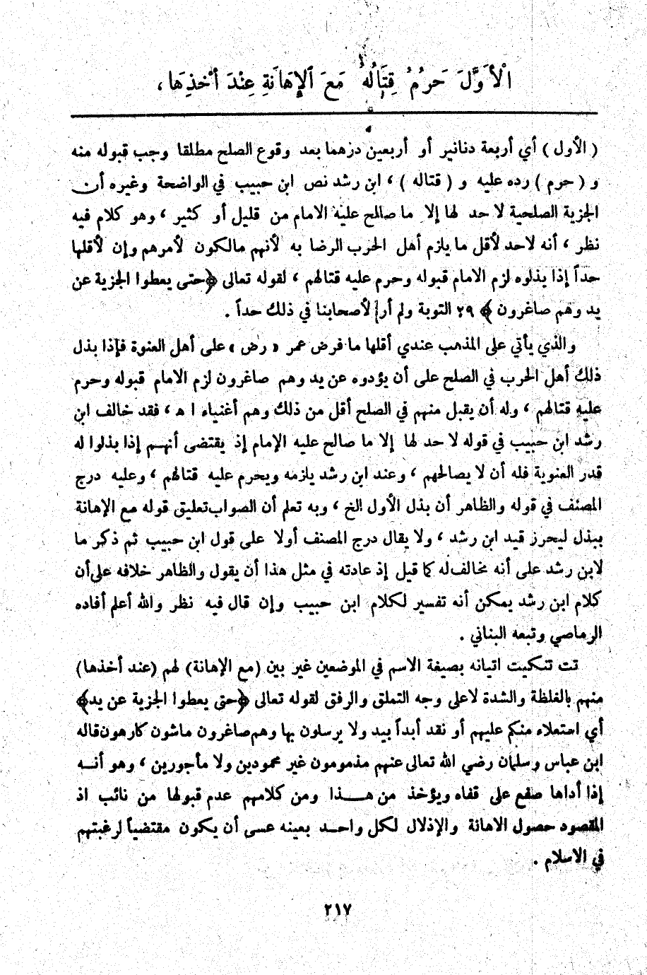 ـــــــــــــــــــــــــــــQالْأَوَّلَ) أَيْ أَرْبَعَةَ دَنَانِيرَ أَوْ أَرْبَعِينَ دِرْهَمًا بَعْدَ وُقُوعِ الصُّلْحِ مُطْلَقًا وَجَبَ قَبُولُهُ مِنْهُ وَ (حَرُمَ) رَدُّهُ عَلَيْهِ وَ (قِتَالُهُ) ابْنُ رُشْدٍ نَصَّ ابْنُ حَبِيبٍ فِي الْوَاضِحَةِ وَغَيْرِهِ أَنَّ الْجِزْيَةَ الصُّلْحِيَّةَ لَا حَدَّ لَهَا إلَّا مَا صَالَحَ عَلَيْهِ الْإِمَامُ مِنْ قَلِيلٍ أَوْ كَثِيرٍ، وَهُوَ كَلَامٌ فِيهِ نَظَرٌ، أَنَّهُ لَا حَدَّ لِأَقَلَّ مَا يَلْزَمُ أَهْلَ الْحَرْبِ الرِّضَا بِهِ لِأَنَّهُمْ مَالِكُونَ لِأَمْرِهِمْ وَإِنَّ لِأَقَلِّهَا حَدًّا إذَا بَذَلُوهُ لَزِمَ الْإِمَامَ قَبُولُهُ وَحَرُمَ عَلَيْهِ قِتَالُهُمْ لِقَوْلِهِ تَعَالَى {حَتَّى يُعْطُوا الْجِزْيَةَ عَنْ يَدٍ وَهُمْ صَاغِرُونَ} [التوبة: 29] وَلَمْ أَرَ لِأَصْحَابِنَا فِي ذَلِكَ حَدًّا.