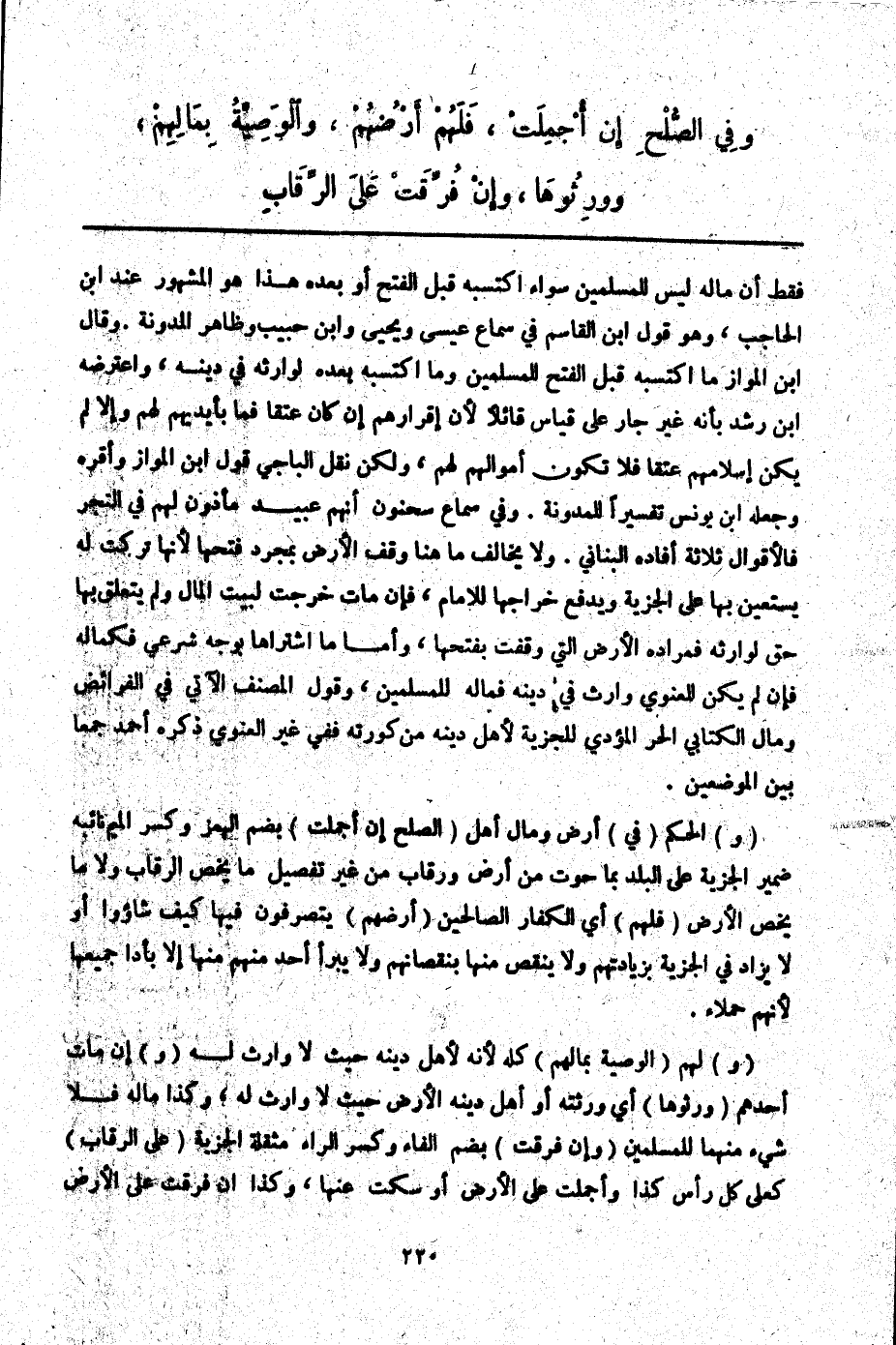 ـــــــــــــــــــــــــــــQفَقَطْ أَنَّ مَالَهُ لَيْسَ لِلْمُسْلِمِينَ سَوَاءً اكْتَسَبَهُ قَبْلَ الْفَتْحِ أَوْ بَعْدَهُ هَذَا هُوَ الْمَشْهُورُ عِنْدَ ابْنِ الْحَاجِبِ، وَهُوَ قَوْلُ ابْنِ الْقَاسِمِ فِي سَمَاعِ عِيسَى وَيَحْيَى وَابْنِ حَبِيبٍ وَظَاهِرُ الْمُدَوَّنَةِ. وَقَالَ ابْنُ الْمَوَّازِ مَا اكْتَسَبَهُ قَبْلَ الْفَتْحِ لِلْمُسْلِمِينَ وَمَا اكْتَسَبَهُ بَعْدَهُ لِوَارِثِهِ فِي دِينِهِ، وَاعْتَرَضَهُ ابْنُ رُشْدٍ بِأَنَّهُ غَيْرُ جَارٍ عَلَى قِيَاسٍ قَائِلًا لِأَنَّ إقْرَارَهُمْ إنْ كَانَ عِتْقًا فَمَا بِأَيْدِيهِمْ لَهُمْ وَإِلَّا لَمْ يَكُنْ إسْلَامُهُمْ عِتْقًا فَلَا تَكُونُ أَمْوَالُهُمْ لَهُمْ، وَلَكِنْ نَقَلَ الْبَاجِيَّ قَوْلَ ابْنِ الْمَوَّازِ وَأَقَرَّهُ وَجَعَلَهُ ابْنُ يُونُسَ تَفْسِيرًا لِلْمُدَوَّنَةِ. وَفِي سَمَاعِ سَحْنُونٍ أَنَّهُمْ عَبِيدٌ مَأْذُونٌ لَهُمْ فِي التَّجْرِ فَالْأَقْوَالُ ثَلَاثَةٌ أَفَادَهُ الْبُنَانِيُّ. وَلَا يُخَالِفُ مَا هُنَا وَقْفَ الْأَرْضِ بِمُجَرَّدِ فَتْحِهَا لِأَنَّهَا تُرِكَتْ لَهُ يَسْتَعِينُ بِهَا عَلَى الْجِزْيَةِ وَيَدْفَعُ خَرَاجَهَا لِلْإِمَامِ، فَإِنْ مَاتَ خَرَجَتْ لِبَيْتِ الْمَالِ وَلَمْ يَتَعَلَّقْ بِهَا حَقٌّ لِوَارِثِهِ فَمُرَادُهُ الْأَرْضُ الَّتِي وُقِفَتْ بِفَتْحِهَا، وَأَمَّا مَا اشْتَرَاهَا بِوَجْهٍ شَرْعِيٍّ فَكَمَالِهِ فَإِنْ لَمْ يَكُنْ لِلْعَنَوِيِّ وَارِثٌ فِي دِينِهِ فَمَالُهُ لِلْمُسْلِمِينَ وَقَوْلُ الْمُصَنِّفِ الْآتِي فِي الْفَرَائِضِ وَمَالُ الْكِتَابِيِّ الْحُرِّ الْمُؤَدِّي لِلْجِزْيَةِ لِأَهْلِ دِينِهِ مِنْ كُورَتِهِ فَفِي غَيْرِ الْعَنْوِيِّ ذَكَرَهُ أَحْمَدُ جَمْعًا بَيْنَ الْمَوْضِعَيْنِ.