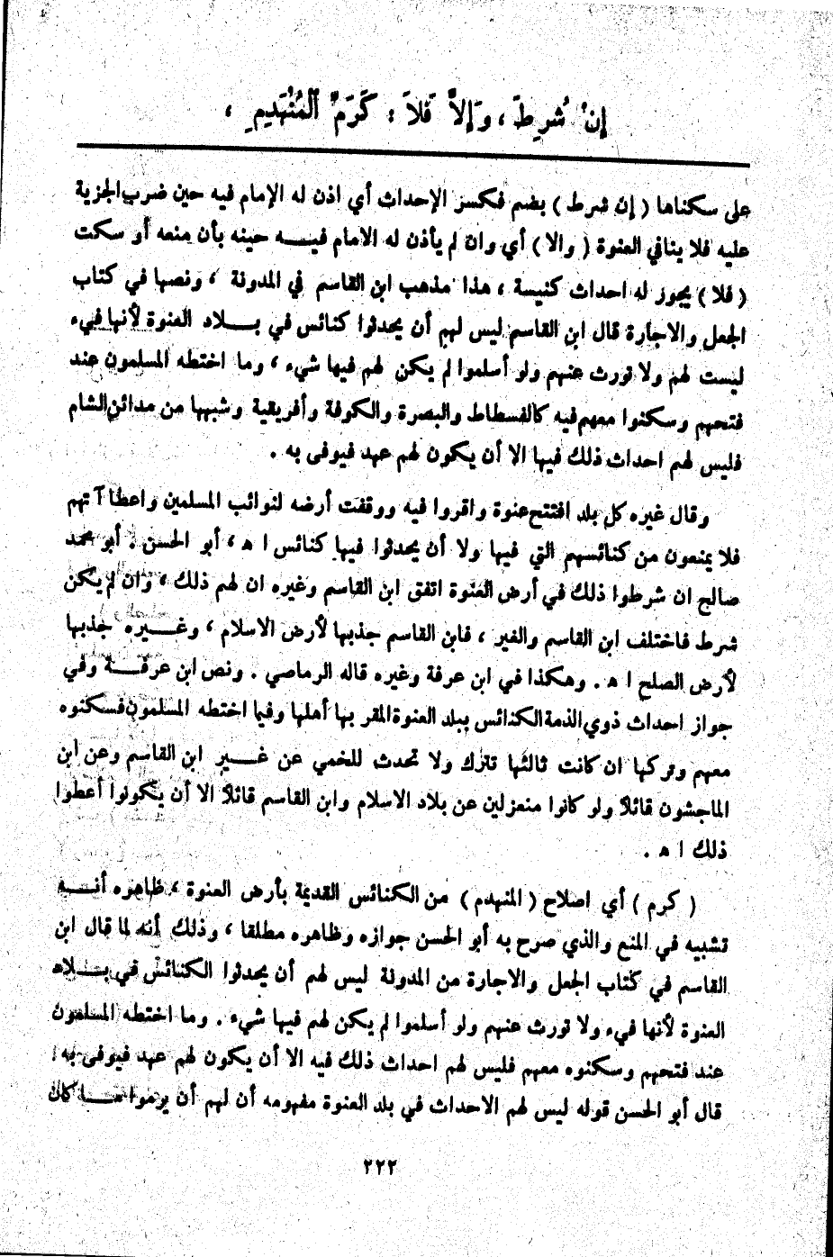 وَقَالَ غَيْرُهُ كُلُّ بَلَدٍ اُفْتُتِحَ عَنْوَةً وَأُقِرُّوا فِيهِ وَوَقَفَتْ أَرْضُهُ لِنَوَائِبِ الْمُسْلِمِينَ وَإِعْطَاءَاتِهِمْ فَلَا يُمْنَعُونَ مِنْ كَنَائِسِهِمْ الَّتِي فِيهَا وَلَا أَنْ يُحْدِثُوا فِيهَا كَنَائِسَ. اهـ. أَبُو الْحَسَنِ. أَبُو مُحَمَّدٍ صَالِحٌ إنْ شَرَطُوا ذَلِكَ فِي أَرْضِ الْعَنْوَةِ اتَّفَقَ ابْنُ الْقَاسِمِ وَغَيْرُهُ أَنَّ لَهُمْ ذَلِكَ، وَإِنْ لَمْ يَكُنْ شَرْطٌ فَاخْتَلَفَ ابْنُ الْقَاسِمِ وَالْغَيْرُ فَابْنُ الْقَاسِمِ جَذَبَهَا لِأَرْضِ الْإِسْلَامِ، وَغَيْرُهُ جَذَبَهَا لِأَرْضِ الصُّلْحِ اهـ. وَهَكَذَا فِي ابْنِ عَرَفَةَ وَغَيْرِهِ قَالَهُ الرَّمَاصِيُّ. وَنَصَّ ابْنُ عَرَفَةَ وَفِي جَوَازِ إحْدَاثِ ذَوِي الذِّمَّةِ الْكَنَائِسَ بِبَلَدِ الْعَنْوَةِ الْمُقَرِّ بِهَا أَهْلُهَا وَفِيمَا اخْتَطَّهُ الْمُسْلِمُونَ فَسَكَنُوهُ مَعَهُمْ وَتَرَكَهَا إنْ كَانَتْ ثَالِثُهَا تُتْرَكُ وَلَا تَحْدُثُ لِلَّخْمِيِّ عَنْ غَيْرِ ابْنِ الْقَاسِمِ وَعَنْ ابْنِ الْمَاجِشُونِ قَائِلًا وَلَوْ كَانُوا مُنْعَزِلِينَ عَنْ بِلَادِ الْإِسْلَامِ وَابْنُ الْقَاسِمِ قَائِلًا إلَّا أَنْ يَكُونُوا أَعْطَوْا ذَلِكَ اهـ. (كَرَمِّ) أَيْ إصْلَاحِ (الْمُنْهَدِمِ) مِنْ الْكَنَائِسِ الْقَدِيمَةِ بِأَرْضِ الْعَنْوَةِ ظَاهِرُهُ أَنَّهُ تَشْبِيهٌ فِي الْمَنْعِ وَاَلَّذِي صَرَّحَ بِهِ أَبُو الْحَسَنِ جَوَازُهُ وَظَاهِرُهُ مُطْلَقًا، وَذَلِكَ أَنَّهُ لَمَّا قَالَ ابْنُ الْقَاسِمِ فِي كِتَابِ الْجُعْلِ وَالْإِجَارَةِ مِنْ الْمُدَوَّنَةِ لَيْسَ لَهُمْ أَنْ يُحْدِثُوا الْكَنَائِسَ فِي بِلَادِ الْعَنْوَةِ لِأَنَّهَا فَيْءٌ وَلَا تُورَثُ عَنْهُمْ وَلَوْ أَسْلَمُوا لَمْ يَكُنْ لَهُمْ فِيهَا شَيْءٌ. وَمَا اخْتَطَّهُ الْمُسْلِمُونَ عِنْدَ فَتْحهمْ وَسَكَنُوهُ مَعَهُمْ فَلَيْسَ لَهُمْ إحْدَاثُ ذَلِكَ فِيهِ إلَّا أَنْ يَكُونَ لَهُمْ عَهْدٌ فَيُوفَى بِهِ. قَالَ أَبُو الْحَسَنِ قَوْلُهُ لَيْسَ لَهُمْ الْإِحْدَاثُ فِي بَلَدِ الْعَنْوَةِ مَفْهُومُهُ أَنَّ لَهُمْ أَنْ يَرُمُّوا مَا كَانَ