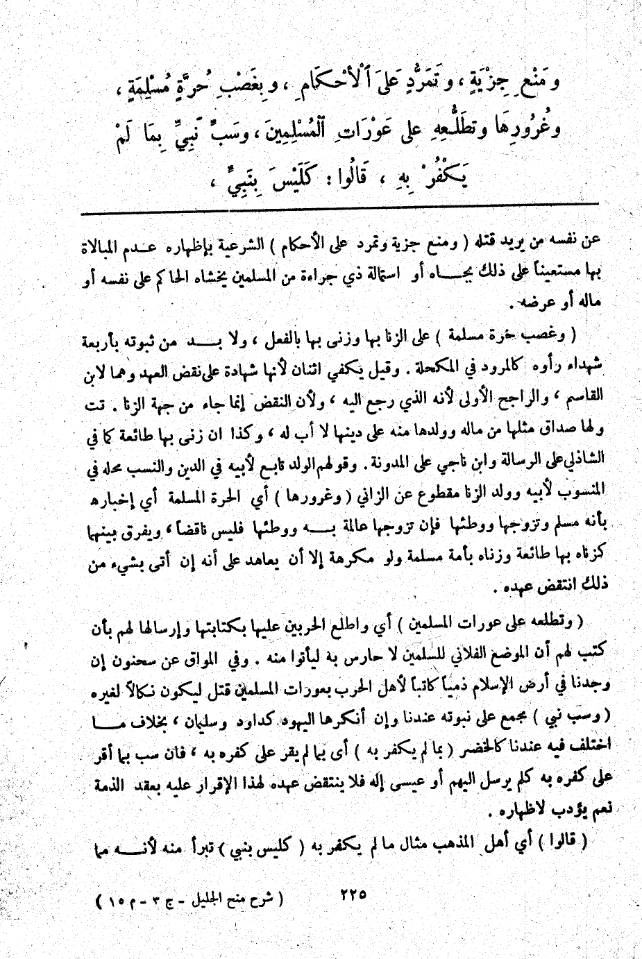 وَمَنْعِ جِزْيَةٍ، وَتَمَرُّدٍ عَلَى الْأَحْكَامِ، وَبِغَصْبِ حُرَّةٍ مُسْلِمَةٍ، وَغُرُورِهَا وَتَطَلُّعِهِ عَلَى عَوْرَاتِ الْمُسْلِمِينَ، وَسَبِّ نَبِيٍّ بِمَا لَمْ يَكْفُرْ بِهِ، قَالُوا: كَلَيْسَ بِنَبِيٍّ،