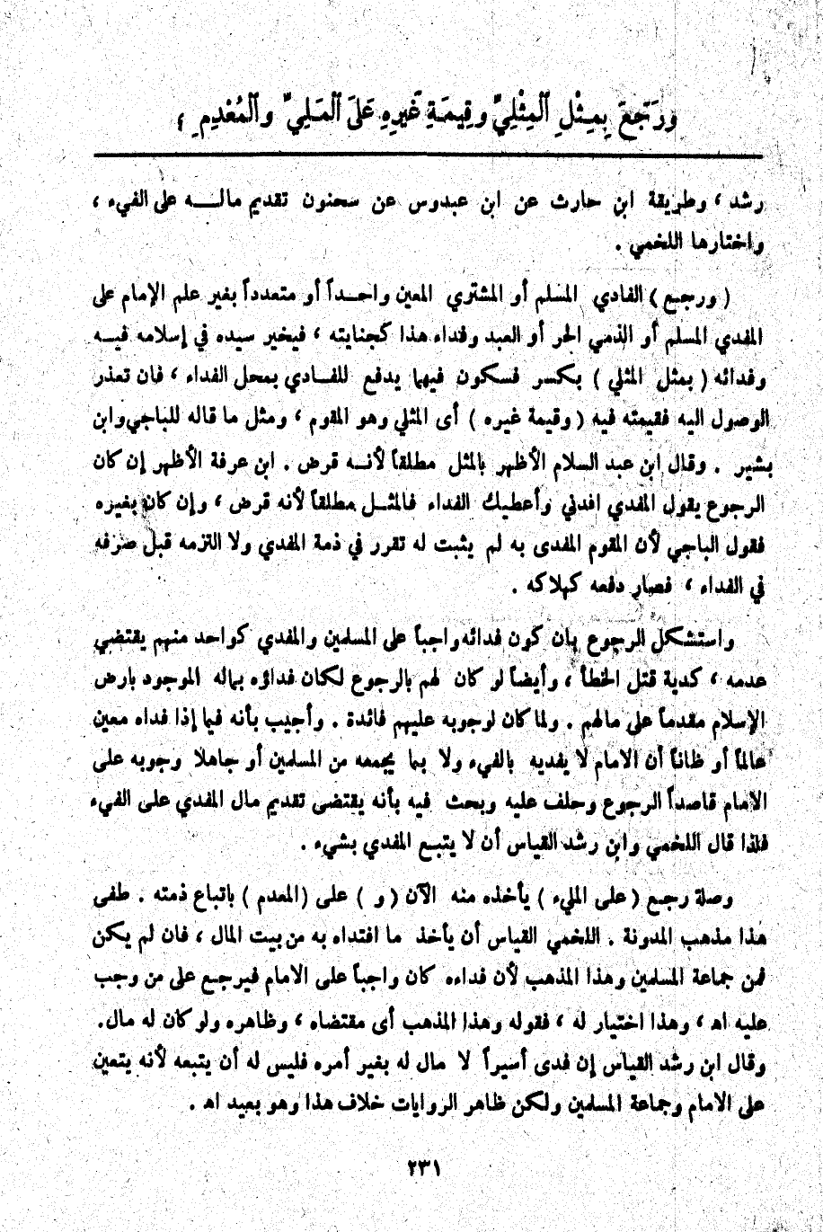 وَاسْتَشْكَلَ الرُّجُوعُ بِأَنَّ كَوْنَ فِدَائِهِ وَاجِبًا عَلَى الْمُسْلِمِينَ وَالْمُفْدِي كَوَاحِدٍ مِنْهُمْ يَقْتَضِي عَدَمَهُ، كَدِيَةِ قَتْلِ الْخَطَأِ، وَأَيْضًا لَوْ كَانَ لَهُمْ بِالرُّجُوعِ لَكَانَ فِدَاؤُهُ بِمَالِهِ الْمَوْجُودِ بِأَرْضِ الْإِسْلَامِ مُقَدَّمًا عَلَى مَالِهِمْ. وَلَمَّا كَانَ لِوُجُوبِهِ عَلَيْهِمْ فَائِدَةٌ. وَأُجِيبَ بِأَنَّهُ فِيمَا إذَا فَدَاهُ مُعَيَّنٌ عَالِمًا أَوْ ظَانًّا أَنَّ الْإِمَامَ لَا يُفْدِيهِ بِالْفَيْءِ وَلَا بِمَا يَجْمَعُهُ مِنْ الْمُسْلِمِينَ أَوْ جَاهِلًا وُجُوبَهُ عَلَى الْإِمَامِ قَاصِدًا الرُّجُوعَ وَحَلَفَ عَلَيْهِ وَبَحَثَ فِيهِ بِأَنَّهُ يَقْتَضِي تَقْدِيمَ مَالِ الْمُفْدِي عَلَى الْفَيْءِ فَلِذَا قَالَ اللَّخْمِيُّ وَابْنُ رُشْدٍ الْقِيَاس أَنْ لَا يُتَّبَعَ الْمُفْدَيْ بِشَيْءٍ.