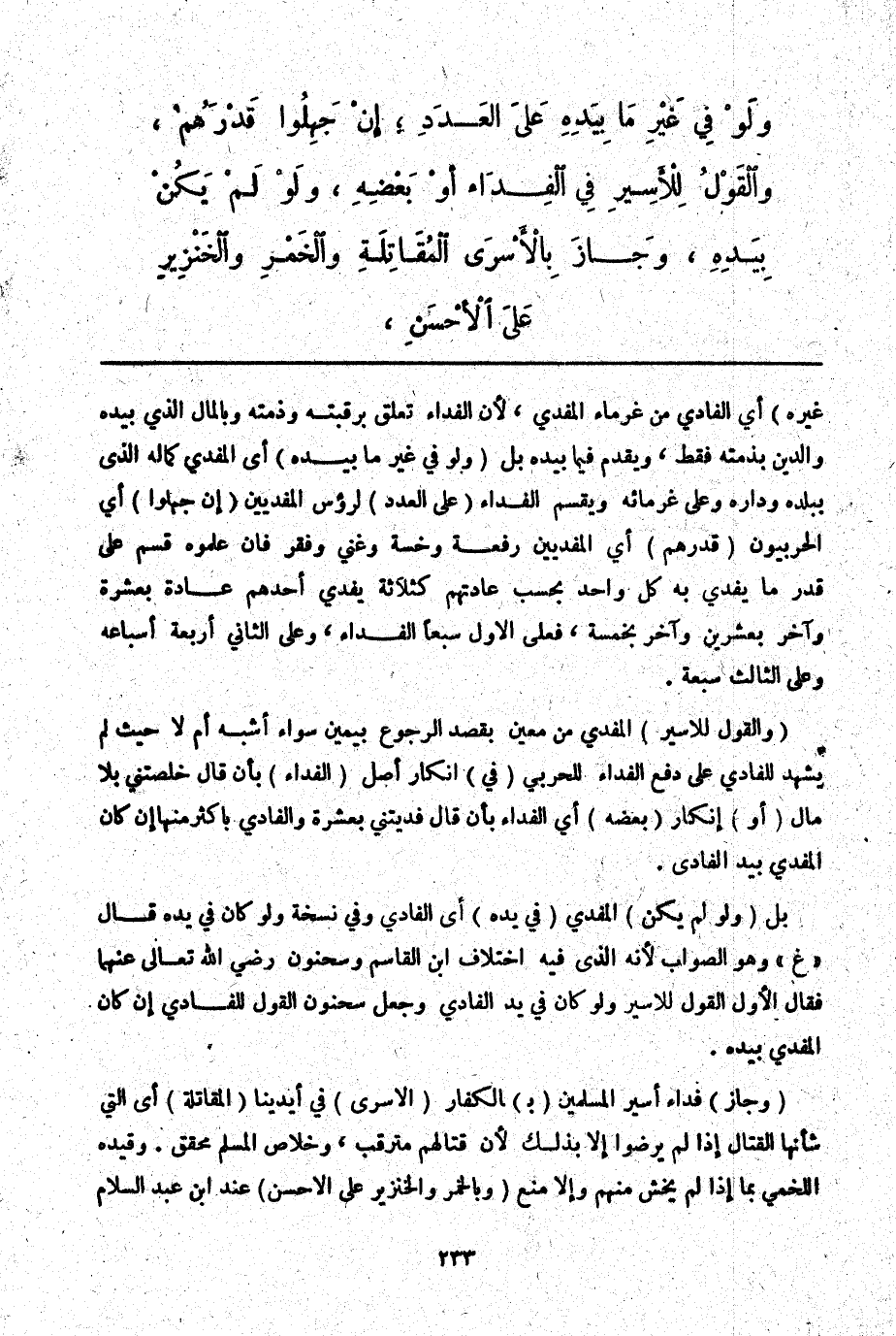ـــــــــــــــــــــــــــــQغَيْرِهِ) أَيْ الْفَادِي مِنْ غُرَمَاءِ الْمُفْدَيْ لِأَنَّ الْفِدَاءَ تَعَلَّقَ بِرَقَبَتِهِ وَذِمَّتِهِ وَبِالْمَالِ الَّذِي بِيَدِهِ وَالدَّيْنُ بِذِمَّتِهِ فَقَطْ، وَيُقَدَّمُ فِيمَا بِيَدِهِ بَلْ (وَلَوْ فِي غَيْرِ مَا بِيَدِهِ) أَيْ الْمُفْدِي كَمَالِهِ الَّذِي بِبَلَدِهِ وَدَارِهِ وَعَلَى غُرَمَائِهِ وَيُقْسَمُ الْفِدَاءُ (عَلَى الْعَدَدِ) لِرُءُوسِ الْمَفْدِيِّينَ (إنْ جَهِلُوا) أَيْ الْحَرْبِيُّونَ (قَدْرَهُمْ) أَيْ الْمَفْدِيِّينَ رِفْعَةً وَخِسَّةً وَغِنًى وَفَقْرًا فَإِنْ عَلِمُوهُ قُسِمَ عَلَى قَدْرِ مَا يُفْدَى بِهِ كُلُّ وَاحِدٍ بِحَسَبِ عَادَتِهِمْ كَثَلَاثَةٍ يُفْدَى أَحَدُهُمْ عَادَةً بِعَشْرَةٍ وَآخَرُ بِعِشْرِينَ وَآخَرُ بِخَمْسَةٍ، فَعَلَى الْأَوَّلِ سُبْعَا الْفِدَاءِ، وَعَلَى الثَّانِي أَرْبَعَةُ أَسْبَاعِهِ وَعَلَى الثَّالِثِ سُبْعُهُ.
