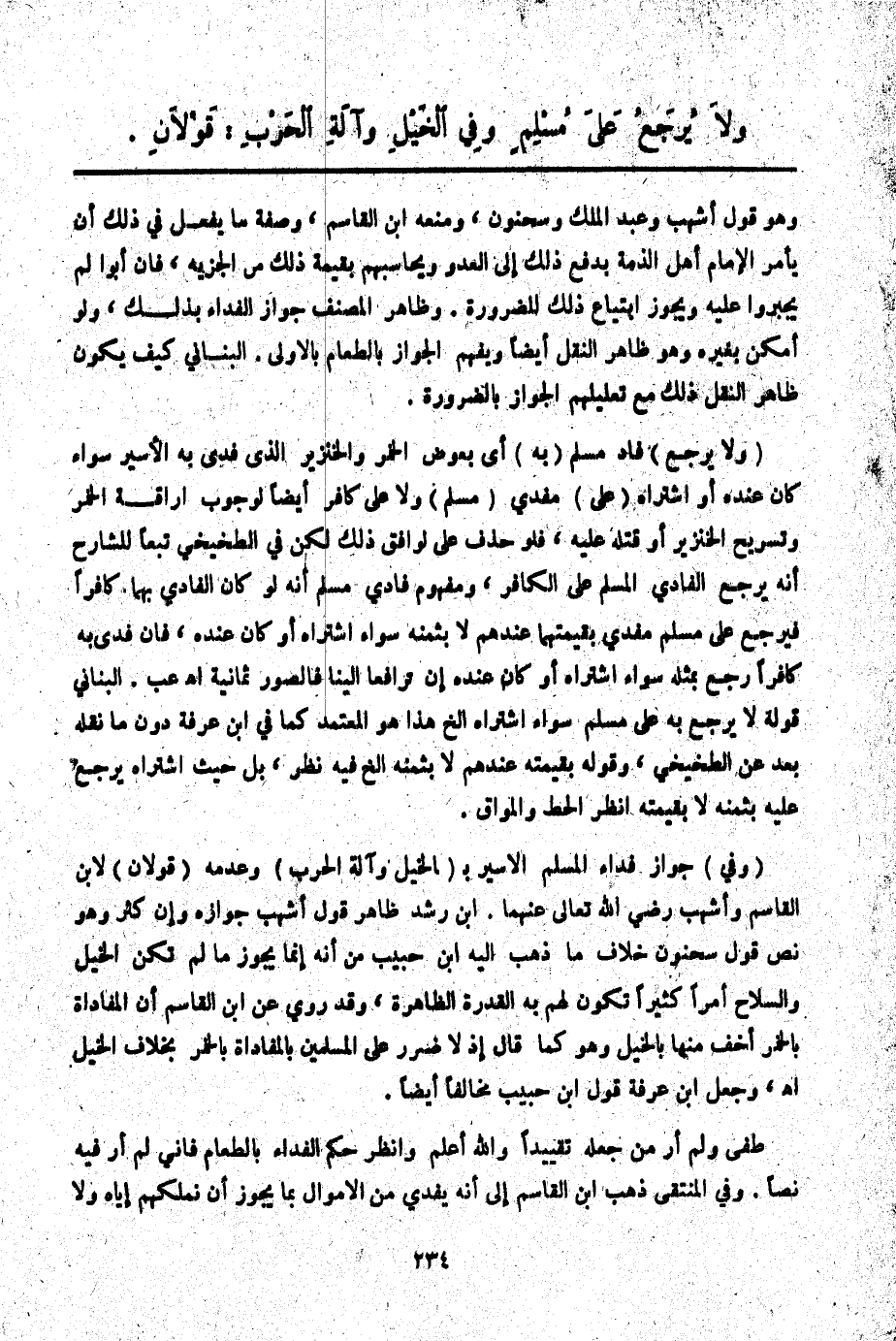 (وَفِي) جَوَازِ فِدَاءِ الْمُسْلِمِ الْأَسِيرِ بِ (الْخَيْلِ وَآلَةِ الْحَرْبِ) وَعَدَمِهِ (قَوْلَانِ) لِابْنِ الْقَاسِمِ وَأَشْهَبَ - رَضِيَ اللَّهُ تَعَالَى عَنْهُمَا -. ابْنُ رُشْدٍ ظَاهِرُ قَوْلِ أَشْهَبَ جَوَازُهُ وَإِنْ كَثُرَ وَهُوَ نَصُّ قَوْلِ سَحْنُونٍ خِلَافُ مَا ذَهَبَ إلَيْهِ ابْنُ حَبِيبٍ مِنْ أَنَّهُ إنَّمَا يَجُوزُ مَا لَمْ تَكُنْ الْخَيْلُ وَالسِّلَاحُ أَمْرًا كَثِيرًا تَكُونُ لَهُمْ بِهِ الْقُدْرَةُ الظَّاهِرَةُ
