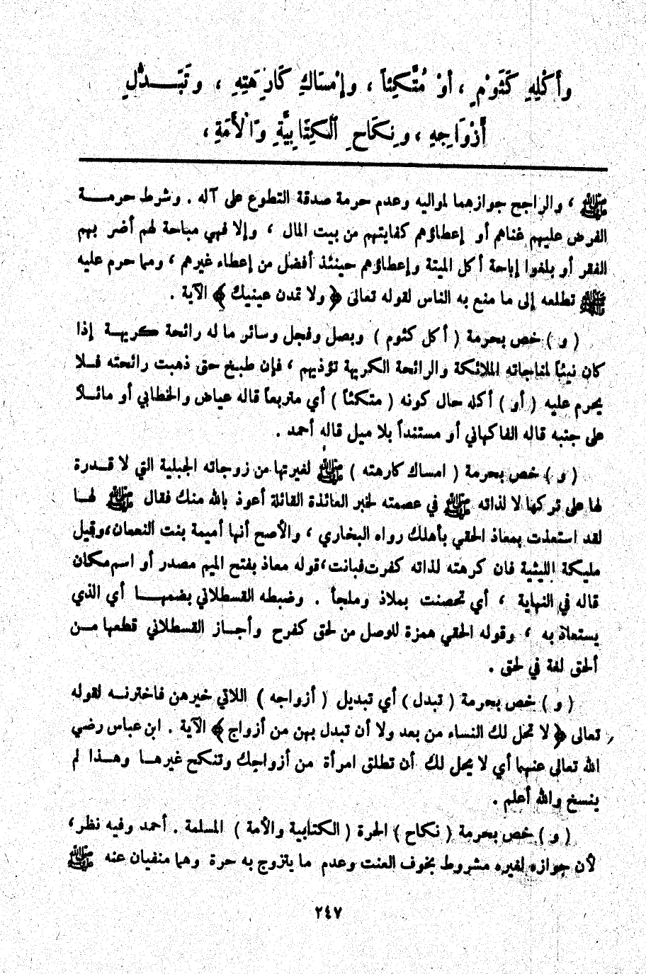 وَأَكْلِهِ كَثُومٍ، أَوْ مُتَّكِئًا، وَإِمْسَاكِ كَارِهَتِهِ، وَتَبَدُّلِ أَزْوَاجِهِ، وَنِكَاحِ الْكِتَابِيَّةِ وَالْأَمَةِ،