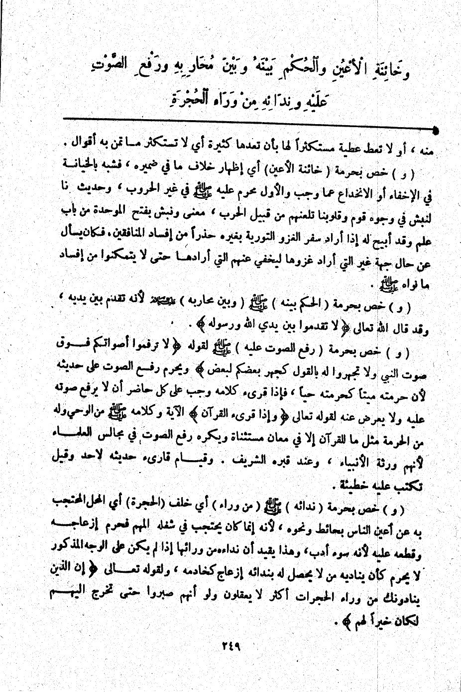 (وَ) خُصَّ بِحُرْمَةِ (رَفْعِ الصَّوْتِ عَلَيْهِ) - صَلَّى اللَّهُ عَلَيْهِ وَسَلَّمَ - لِقَوْلِهِ {لا تَرْفَعُوا أَصْوَاتَكُمْ فَوْقَ صَوْتِ النَّبِيِّ وَلا تَجْهَرُوا لَهُ بِالْقَوْلِ كَجَهْرِ بَعْضِكُمْ لِبَعْضٍ} [الحجرات: 2] وَيَحْرُمُ رَفْعُ الصَّوْتِ عَلَى حَدِيثِهِ لِأَنَّ حُرْمَتَهُ مَيِّتًا كَحُرْمَتِهِ حَيًّا فَإِذَا قُرِئَ كَلَامُهُ وَجَبَ عَلَى كُلِّ حَاضِرٍ أَنْ لَا يَرْفَعَ صَوْتَهُ عَلَيْهِ وَلَا يُعْرِضُ عَنْهُ لِقَوْلِهِ تَعَالَى {وَإِذَا قُرِئَ الْقُرْآنُ} [الأعراف: 204] الْآيَةَ وَكَلَامُهُ - صَلَّى اللَّهُ عَلَيْهِ وَسَلَّمَ - مِنْ الْوَحْيِ وَلَهُ مِنْ الْحُرْمَةِ مِثْلُ مَا لِلْقُرْآنِ إلَّا فِي مَعَانٍ مُسْتَثْنَاةٍ وَيُكْرَهُ رَفْعُ الصَّوْتِ فِي مَجَالِسِ الْعُلَمَاءِ لِأَنَّهُمْ وَرَثَةُ الْأَنْبِيَاءِ، وَعِنْدَ قَبْرِهِ الشَّرِيفِ. وَقِيَامُ قَارِئِ حَدِيثِهِ لِأَحَدٍ وَقِيلَ تُكْتَبُ عَلَيْهِ خَطِيئَةٌ.