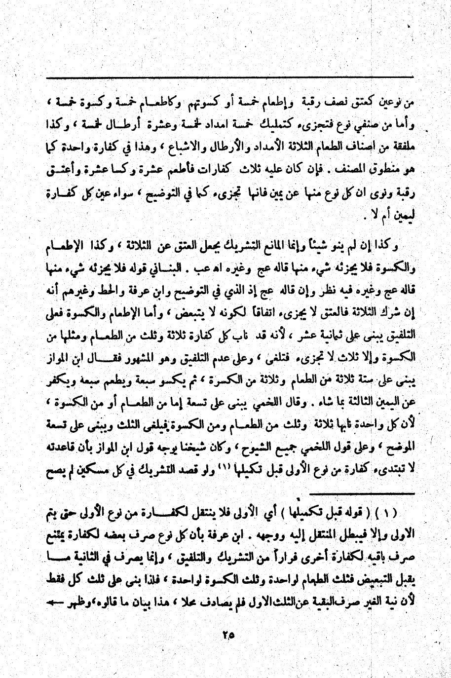 وَكَذَا إنْ لَمْ يَنْوِ شَيْئًا وَإِنَّمَا الْمَانِعُ التَّشْرِيكُ بِجَعْلِ الْعِتْقِ عَنْ الثَّلَاثَةِ، وَكَذَا الْإِطْعَامُ وَالْكِسْوَةُ فَلَا يُجْزِئُهُ شَيْءٌ مِنْهَا قَالَهُ عج وَغَيْرُهُ اهـ عب. الْبُنَانِيُّ قَوْلُهُ فَلَا يُجْزِئُهُ شَيْءٌ مِنْهَا قَالَهُ عج وَغَيْرُهُ فِيهِ نَظَرٌ وَإِنْ قَالَهُ عج إذْ الَّذِي فِي التَّوْضِيحِ وَابْنِ عَرَفَةَ وَالْحَطّ وَغَيْرِهِمْ أَنَّهُ إنْ شَرَكَ الثَّلَاثَةَ فَالْعِتْقُ لَا يُجْزِئُ اتِّفَاقًا لِكَوْنِهِ لَا يَتَبَعَّضُ، وَأَمَّا الْإِطْعَامُ وَالْكِسْوَةُ فَعَلَى التَّلْفِيقِ يُبْنَى عَلَى ثَمَانِيَةَ عَشَرَ لِأَنَّهُ قَدْ نَابَ كُلَّ كَفَّارَةٍ ثَلَاثَةُ وَثُلُثٌ مِنْ الطَّعَامِ وَمِثْلُهَا مِنْ الْكِسْوَةِ وَإِلَّا ثَلَاثَ لَا تُجْزِئُ فَتُلْغَى، وَعَلَى عَدَمِ التَّلْفِيقِ وَهُوَ الْمَشْهُورُ فَقَالَ ابْنُ الْمَوَّازِ يَبْنِي عَلَى سِتَّةٍ ثَلَاثَةً مِنْ الطَّعَامِ وَثَلَاثَةً مِنْ الْكِسْوَةِ، ثُمَّ يَكْسُو سَبْعَةً وَيُطْعِمُ سَبْعَةً وَيُكَفِّرُ عَنْ الْيَمِينِ الثَّالِثَةِ بِمَا شَاءَ. وَقَالَ اللَّخْمِيُّ يَبْنِي عَلَى تِسْعَةٍ إمَّا مِنْ الطَّعَامِ أَوْ مِنْ الْكِسْوَةِ لِأَنَّ كُلَّ وَاحِدَةٍ نَابَهَا ثَلَاثَةٌ وَثُلُثٌ مِنْ الطَّعَامِ وَمِنْ الْكِسْوَةِ فَيُلْغِي الثُّلُثَ وَيَبْنِي عَلَى تِسْعَةٍ الْمُوَضِّحُ، وَعَلَى قَوْلِ اللَّخْمِيِّ جَمِيعُ الشُّيُوخِ، وَكَانَ شَيْخُنَا يُوَجِّهُ قَوْلَ ابْنِ الْمَوَّازِ بِأَنَّ قَاعِدَتَهُ لَا تَبْتَدِئُ كَفَّارَةٌ مِنْ نَوْعِ الْأُولَى قَبْلَ تَكْمِيلِهَا وَلَوْ قَصَدَ التَّشْرِيكَ فِي كُلِّ مِسْكِينٍ لَمْ يَصِحَّ