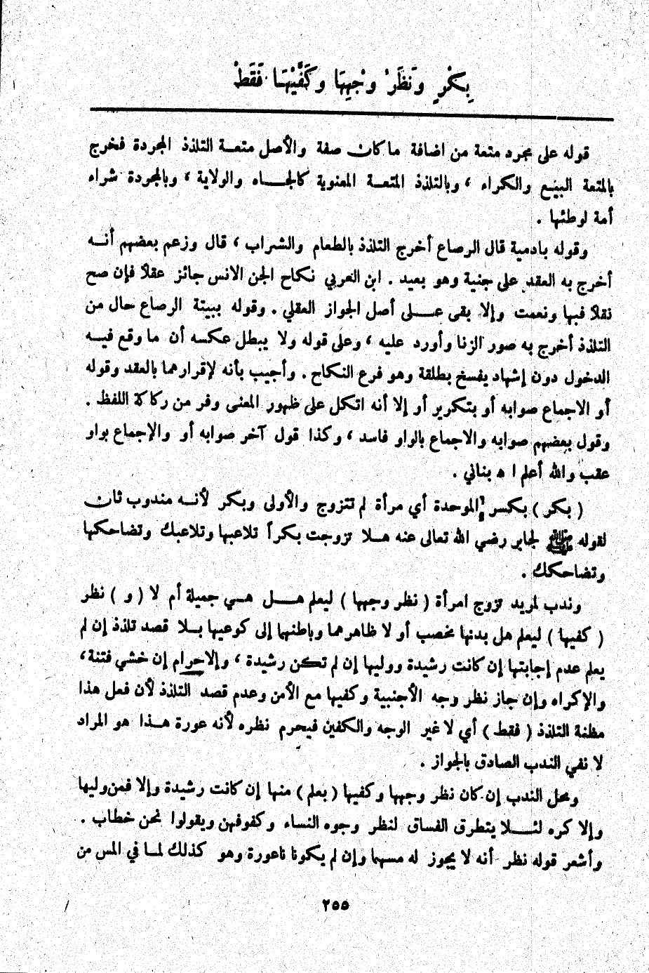 وَنُدِبَ لِمُرِيدِ تَزَوُّجِ امْرَأَةٍ (نَظَرُ وَجْهِهَا) لِيَعْلَمَ هَلْ هِيَ جَمِيلَةٌ أَمْ لَا (وَ) نَظَرُ (كَفَّيْهَا) لِيَعْلَمَ هَلْ بَدَنُهَا مُخْصِبٌ أَوْ لَا ظَاهِرِهِمَا وَبَاطِنِهِمَا إلَى كُوعَيْهَا بِلَا قَصْدِ تَلَذُّذٍ إنْ لَمْ يَعْلَمْ عَدَمَ إجَابَتِهَا إنْ كَانَتْ رَشِيدَةً وَوَلِيِّهَا إنْ لَمْ تَكُنْ رَشِيدَةً، وَإِلَّا حَرُمَ إنْ خَشِيَ فِتْنَةً، وَإِلَّا كُرِهَ وَإِنْ جَازَ نَظَرُ وَجْهِ الْأَجْنَبِيَّةِ وَكَفَّيْهَا مَعَ الْأَمْنِ وَعَدَمِ قَصْدِ التَّلَذُّذِ لِأَنَّ فِعْلَ هَذَا مَظِنَّةُ التَّلَذُّذِ (فَقَطْ) أَيْ لَا غَيْرَ الْوَجْهِ وَالْكَفَّيْنِ فَيَحْرُمُ نَظَرُهُ لِأَنَّهُ عَوْرَةٌ هَذَا هُوَ الْمُرَادُ لَا نَفْيُ النَّدْبِ الصَّادِقِ بِالْجَوَازِ. وَمَحَلُّ النَّدْبِ إنْ كَانَ نَظَرَ وَجْهَهَا وَكَفَّيْهَا (بِعِلْمٍ) مِنْهَا إنْ كَانَتْ رَشِيدَةً وَإِلَّا فَمِنْ وَلِيِّهَا وَإِلَّا كُرِهَ لِئَلَّا يَتَطَرَّقَ الْفُسَّاقُ لِنَظَرِ وُجُوهِ النِّسَاءِ وَكُفُوفِهِنَّ وَيَقُولُوا نَحْنُ خُطَّابٌ. وَأَشْعَرَ قَوْلُهُ نَظَرُ أَنَّهُ لَا يَجُوزُ لَهُ مَسُّهُمَا وَإِنْ لَمْ يَكُونَا عَوْرَةً وَهُوَ كَذَلِكَ لِمَا فِي الْمَسِّ مِنْ