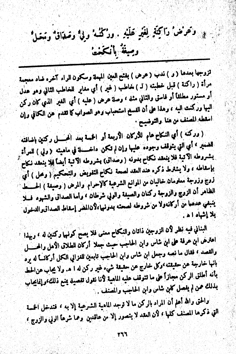 (وَرُكْنُهُ) أَيْ النِّكَاحِ عَامٌّ لِلْأَرْكَانِ الْأَرْبَعَةِ أَوْ الْخَمْسَةِ بَعْدَ الْمَحَلِّ رُكْنَيْنِ بِإِضَافَتِهِ لِلضَّمِيرِ، أَيْ الَّتِي يَتَوَقَّفُ وُجُودُهُ عَلَيْهَا وَإِنْ لَمْ تَكُنْ دَاخِلَةً فِي مَاهِيَّتِهِ (وَلِيٌّ) لِلْمَرْأَةِ بِشُرُوطِهِ الْآتِيَةِ فَلَا يَنْعَقِدُ نِكَاحٌ بِدُونِهِ (وَصَدَاقٌ) بِشُرُوطِهِ الْآتِيَةِ أَيْضًا فَلَا يَنْعَقِدُ نِكَاحٌ بِإِسْقَاطِهِ، وَلَا يُشْتَرَطُ ذِكْرُهُ عِنْدَ الْعَقْدِ لِصِحَّةِ نِكَاحِ التَّفْوِيضِ وَالتَّحْكِيمِ (وَمَحَلٌّ) أَيْ زَوْجٌ وَزَوْجَةٌ مَعْلُومَانِ خَالِيَانِ مِنْ الْمَوَانِعِ الشَّرْعِيَّةِ كَالْإِحْرَامِ وَالْمَرَضِ (وَصِيغَةٌ) الْحَطّ الظَّاهِرُ أَنَّ الزَّوْجَ وَالزَّوْجَةَ رُكْنَانِ وَالصِّيغَةَ وَالْوَلِيَّ شَرْطَانِ، وَأَمَّا الصَّدَاقُ وَالشُّهُودُ فَلَا يَنْبَغِي عَدُّهُمَا مِنْ أَرْكَانِهِ وَلَا مِنْ شُرُوطِهِ لِصِحَّتِهِ بِدُونِهِمَا لِأَنَّ الْمُضِرَّ إسْقَاطُ الصَّدَاقِ، وَالدُّخُولُ بِلَا إشْهَادٍ اهـ.