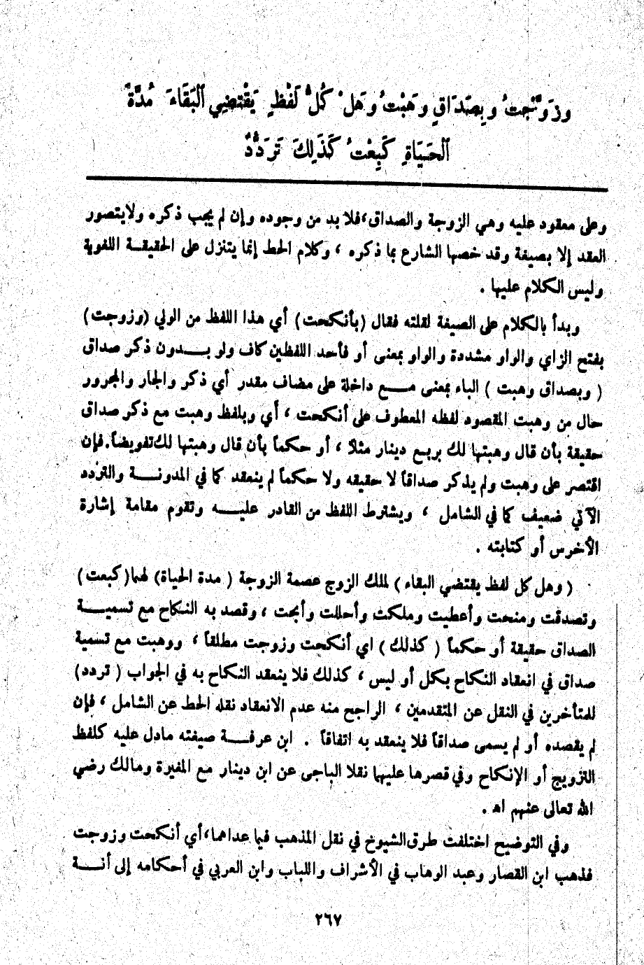 (وَهَلْ كُلُّ لَفْظٍ يَقْتَضِي الْبَقَاءَ) لِمِلْكِ الزَّوْجِ عِصْمَةَ الزَّوْجَةِ (مُدَّةَ الْحَيَاةِ) لَهُمَا (كَبِعْتُ) وَتَصَدَّقْتُ وَمَنَحْتُ وَأَعْطَيْتُ وَمَلَكْتُ وَأَحْلَلْت وَأَبَحْت، وَقُصِدَ بِهِ النِّكَاحُ مَعَ تَسْمِيَةِ الصَّدَاقِ حَقِيقَةً أَوْ حُكْمًا (كَذَلِكَ) أَيْ أَنْكَحْتُ وَزَوَّجْت مُطْلَقًا، وَوَهَبْتُ مَعَ تَسْمِيَةِ صَدَاقٍ فِي انْعِقَادِ النِّكَاحِ بِكُلٍّ أَوْ لَيْسَ كَذَلِكَ فَلَا يَنْعَقِدُ النِّكَاحُ بِهِ فِي الْجَوَابِ (تَرَدُّدٌ) لِلْمُتَأَخِّرِينَ فِي النَّقْلِ عَنْ الْمُتَقَدِّمِينَ الرَّاجِحُ مِنْهُ عَدَمُ الِانْعِقَادِ نَقَلَ الْحَطّ عَنْ الشَّامِلِ، فَإِنْ لَمْ يَقْصِدْهُ أَوْ لَمْ يُسَمَّى صَدَاقًا فَلَا يَنْعَقِدُ بِهِ اتِّفَاقًا. ابْنُ عَرَفَةَ صِيغَتُهُ مَا دَلَّ عَلَيْهِ كَلَفْظِ التَّزْوِيجِ أَوْ الْإِنْكَاحِ وَفِي قَصْرِهَا عَلَيْهِمَا نَقْلًا الْبَاجِيَّ عَنْ ابْنِ دِينَارٍ مَعَ الْمُغِيرَةِ وَمَالِكٍ - رَضِيَ اللَّهُ تَعَالَى عَنْهُمْ - اهـ.