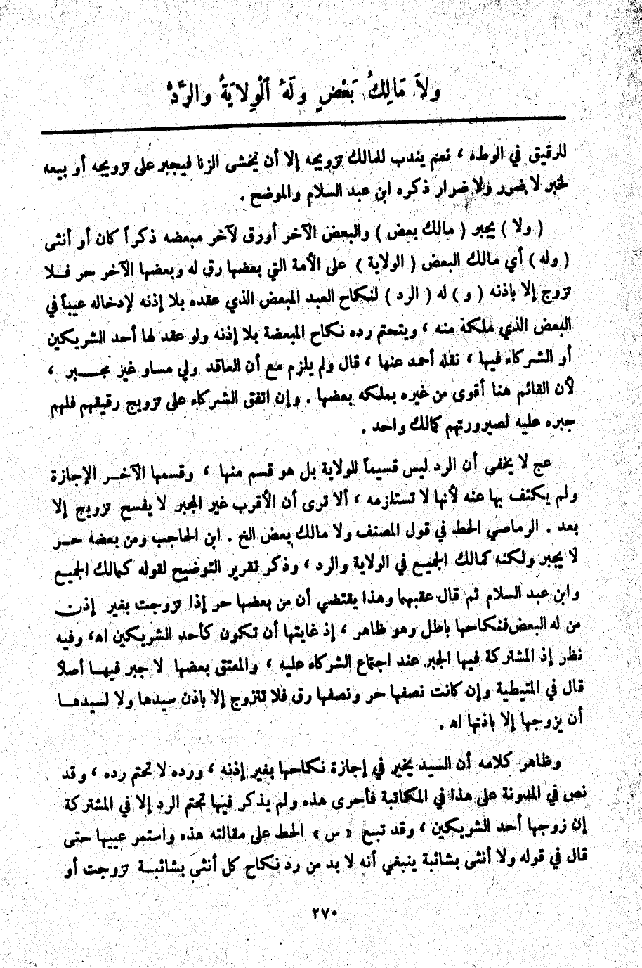 عج لَا يَخْفَى أَنَّ الرَّدَّ لَيْسَ قَسِيمًا لِلْوِلَايَةِ بَلْ هُوَ قِسْمٌ مِنْهَا، وَقِسْمُهَا الْآخَرُ الْإِجَازَةُ وَلَمْ يَكْتَفِ بِهَا عَنْهُ لِأَنَّهَا لَا تَسْتَلْزِمُهُ أَلَا تَرَى أَنَّ الْأَقْرَبَ غَيْرَ الْمُجْبِرِ لَا يَفْسَخُ تَزْوِيجَ الْأَبْعَدِ. الرَّمَاصِيُّ الْحَطُّ فِي قَوْلِ الْمُصَنِّفِ وَلَا مَالِكُ بَعْضٍ إلَخْ. ابْنُ الْحَاجِبِ وَمَنْ بَعْضُهُ حُرٌّ لَا يُجْبَرُ وَلَكِنَّهُ كَمَالِكِ الْجَمِيعِ فِي الْوِلَايَةِ وَالرَّدِّ، وَذَكَرَ تَقْرِيرَ التَّوْضِيحِ لِقَوْلِهِ كَمَالِكِ الْجَمِيعِ وَابْنِ عَبْدِ السَّلَامِ ثُمَّ قَالَ عَقِبَهُمَا وَهَذَا يَقْتَضِي أَنَّ مَنْ بَعْضُهَا حُرٌّ إذَا تَزَوَّجَتْ بِغَيْرِ إذْنِ مَنْ لَهُ الْبَعْضُ فَنِكَاحُهَا بَاطِلٌ وَهُوَ ظَاهِرٌ، إذْ غَايَتُهَا أَنْ تَكُونَ كَأَحَدِ الشَّرِيكَيْنِ. اهـ. وَفِيهِ نَظَرٌ إذْ الْمُشْتَرَكَةُ فِيهَا الْجَبْرُ عِنْدَ اجْتِمَاعِ الشُّرَكَاءِ عَلَيْهِ، وَالْمُعْتَقُ بَعْضُهَا لَا جَبْرَ فِيهَا أَصْلًا قَالَ فِي الْمُتَيْطِيَّةِ وَإِنْ كَانَتْ نِصْفُهَا حُرٌّ وَنِصْفُهَا رِقٌّ فَلَا تَتَزَوَّجُ إلَّا بِإِذْنِ سَيِّدِهَا وَلَا لِسَيِّدِهَا أَنْ يُزَوِّجَهَا إلَّا بِإِذْنِهَا اهـ.