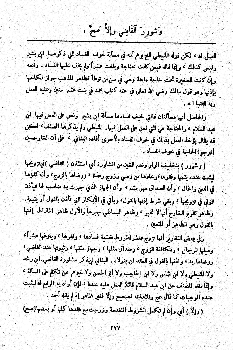 وَفِي بَعْضِ التَّقَارِيرِ أَنَّهَا تُزَوَّجُ بِعَشْرَةِ شُرُوطٍ خَشْيَةِ فَسَادِهَا، وَفَقْرِهَا، وَبُلُوغِهَا عَشْرًا، وَمَيْلِهَا لِلرِّجَالِ، وَمُكَافَئَةِ الزَّوْجِ، وَصَدَاقِ مِثْلِهَا، وَجِهَازِ مِثْلِهَا، وَثُبُوتِهَا عِنْدَ الْقَاضِي، وَرِضَاهَا بِهِ، وَإِذْنِهَا بِالْقَوْلِ فِي الْعَقْدِ لِمَنْ يَتَوَلَّاهُ. الْبُنَانِيُّ لَمْ يَذْكُرْ مُشَاوَرَةَ الْقَاضِي. ابْنُ رُشْدٍ وَلَا الْمُتَيْطِيُّ وَلَا ابْنُ شَاسٍ وَلَا ابْنُ الْحَاجِبِ وَلَا أَبُو الْحَسَنِ وَلَا غَيْرُهُمْ مِمَّنْ تَكَلَّمَ عَلَى الْمَسْأَلَةِ، وَإِنَّمَا نَقَلَهُ الْمُصَنِّفُ عَنْ ابْنِ عَبْدِ السَّلَامِ قَائِلًا الْعَمَلُ عَلَيْهِ عِنْدَنَا، فَإِنْ أَرَادَ بِهِ الرَّفْعَ لَهُ لِيَثْبُتَ عِنْدَهُ الْمُوجِبَاتُ كَمَا قَالَ عج وَتَلَامِذَتُهُ فَصَحِيحٌ وَإِلَّا فَغَيْرُ ظَاهِرٍ إذْ لَمْ يَقُلْهُ أَحَدٌ.