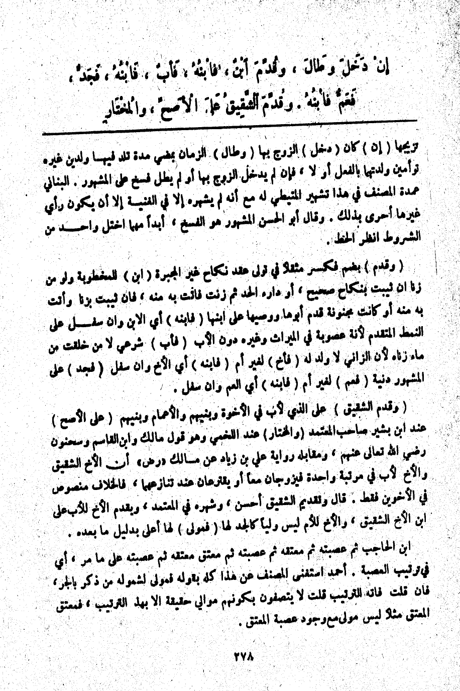 وَقُدِّمَ ابْنٌ، فَابْنُهُ، فَأَبٌ، فَابْنُهُ، فَجَدٌّ، فَعَمٌّ فَابْنُهُ. وَقُدِّمَ الشَّقِيقُ عَلَى الْأَصَحِّ وَالْمُخْتَارِ