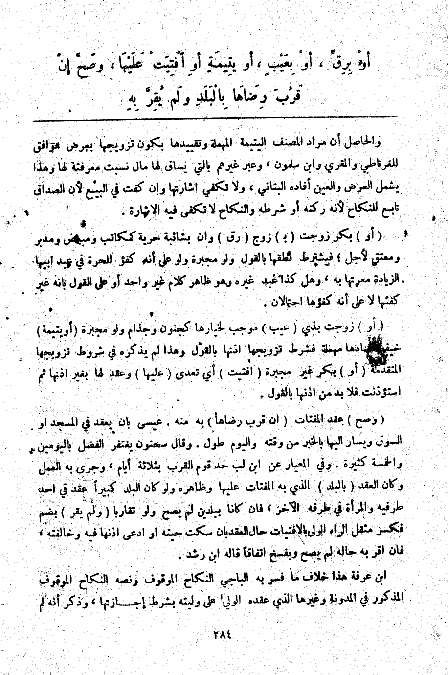 ـــــــــــــــــــــــــــــQوَالْحَاصِلُ أَنَّ مُرَادَ الْمُصَنِّفِ الْيَتِيمَةُ الْمُهْمَلَةُ وَتَقْيِيدُهَا بِكَوْنِ تَزْوِيجِهَا بِعَرْضٍ مُوَافِقٌ لِلْغِرْنَاطِيُّ وَالْمُقْرِي وَابْنِ سَلْمُونٍ، وَعَبَّرَ غَيْرُهُمْ بِاَلَّتِي يُسَاقُ لَهَا مَالٌ نُسِبَتْ مَعْرِفَتُهُ لَهَا وَهَذَا يَشْمَلُ الْعَرْضَ وَالْعَيْنَ أَفَادَهُ الْبُنَانِيُّ، وَلَا تَكْفِي إشَارَتُهَا وَإِنْ كَفَتْ فِي الْبَيْعِ لِأَنَّ الصَّدَاقَ تَابِعٌ لِلنِّكَاحِ لِأَنَّهُ رُكْنُهُ أَوْ شَرْطُهُ وَالنِّكَاحُ لَا تَكْفِي فِيهِ الْإِشَارَةُ.