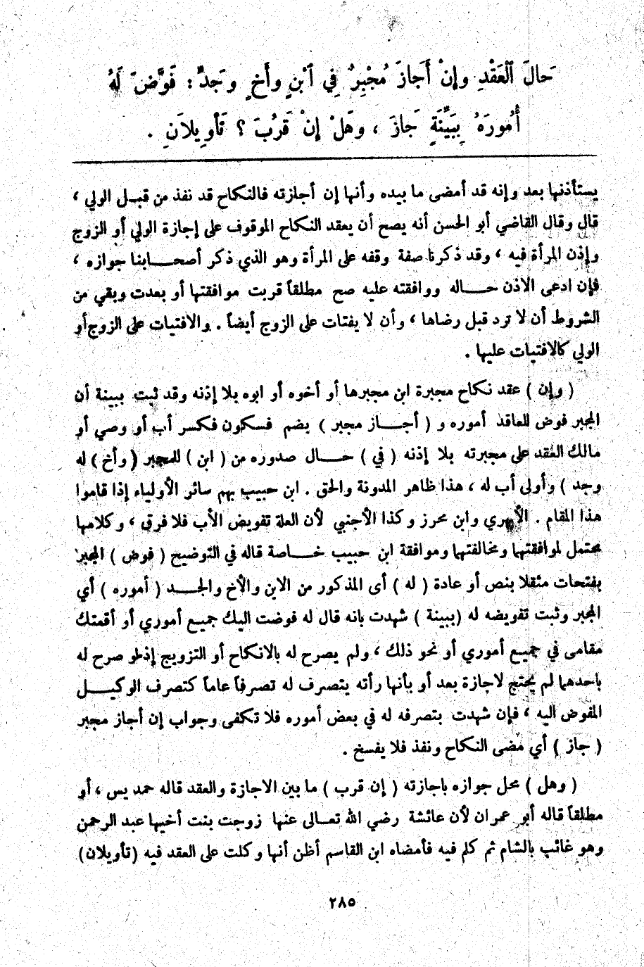 (وَإِنْ) عَقَدَ نِكَاحَ مُجْبَرَةٍ ابْنُ مُجْبِرِهَا أَوْ أَخُوهُ أَوْ أَبَوَاهُ بِلَا إذْنِهِ وَقَدْ ثَبَتَ بِبَيِّنَةٍ أَنَّ الْمُجْبِرَ فَوَّضَ لِلْعَاقِدِ أُمُورَهُ وَ (أَجَازَ مُجْبِرٌ) بِضَمٍّ فَسُكُونٍ فَكَسْرٍ أَبٌ أَوْ وَصِيٌّ أَوْ مَالِكُ الْعَقْدِ عَلَى مُجْبَرَتِهِ بِلَا إذْنِهِ (فِي) حَالِ صُدُورِهِ مِنْ (ابْنٍ) لِلْمُجْبِرِ (وَأَخٍ لَهُ وَجَدٍّ) وَأَوْلَى أَبٌ لَهُ، هَذَا ظَاهِرُ الْمُدَوَّنَةِ وَأَلْحَقَ ابْنُ حَبِيبٍ بِهِمْ سَائِرَ الْأَوْلِيَاءِ إذَا قَامُوا هَذَا الْمَقَامَ. الْأَبْهَرِيُّ وَابْنُ مُحْرِزٍ وَكَذَا الْأَجْنَبِيُّ لِأَنَّ الْعِلَّةَ تَفْوِيضُ الْأَبِ فَلَا فَرْقَ، وَكَلَامُهَا مُحْتَمِلٌ لِمُوَافَقَتِهِمَا وَمُخَالَفَتِهِمَا وَمُوَافَقَةِ ابْنِ حَبِيبٍ خَاصَّةً قَالَهُ فِي التَّوْضِيحِ (فَوَّضَ) الْمُجْبِرُ بِفَتَحَاتٍ مُثَقَّلًا بِنَصٍّ أَوْ عَادَةٍ (لَهُ) أَيْ الْمَذْكُورِ مِنْ الِابْنِ وَالْأَخِ وَالْجَدِّ (أُمُورَهُ) أَيْ الْمُجْبِرِ وَثَبَتَ تَفْوِيضُهُ لَهُ (بِبَيِّنَةٍ) شَهِدَتْ بِأَنَّهُ قَالَ لَهُ فَوَّضْت إلَيْك جَمِيعَ أُمُورِي أَوْ أَقَمْتُك مَقَامِي فِي جَمِيعِ أُمُورِي أَوْ نَحْوَ ذَلِكَ، وَلَمْ يُصَرِّحْ لَهُ بِالْإِنْكَاحِ أَوْ التَّزْوِيجِ إذْ لَوْ صَرَّحَ لَهُ بِأَحَدِهِمَا لَمْ يَحْتَجْ لِإِجَازَةٍ بَعْدُ أَوْ بِأَنَّهَا رَأَتْهُ يَتَصَرَّفُ لَهُ تَصَرُّفًا عَامًّا كَتَصَرُّفِ الْوَكِيلِ الْمُفَوَّضِ إلَيْهِ، فَإِنْ شَهِدَتْ بِتَصَرُّفِهِ لَهُ فِي بَعْضِ أُمُورِهِ فَلَا تَكْفِي وَجَوَابُ إنْ أَجَازَ مُجْبِرٌ (جَازَ) أَيْ مَضَى النِّكَاحُ وَنَفَذَ فَلَا يُفْسَخُ.